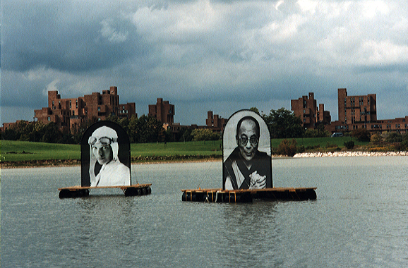 Rafts bearing the images of Amelia Earhardt and the Dalai Lama float on Lake LaSalle as part of the "Pursuasions" exhibit in the UB Art Gallery.