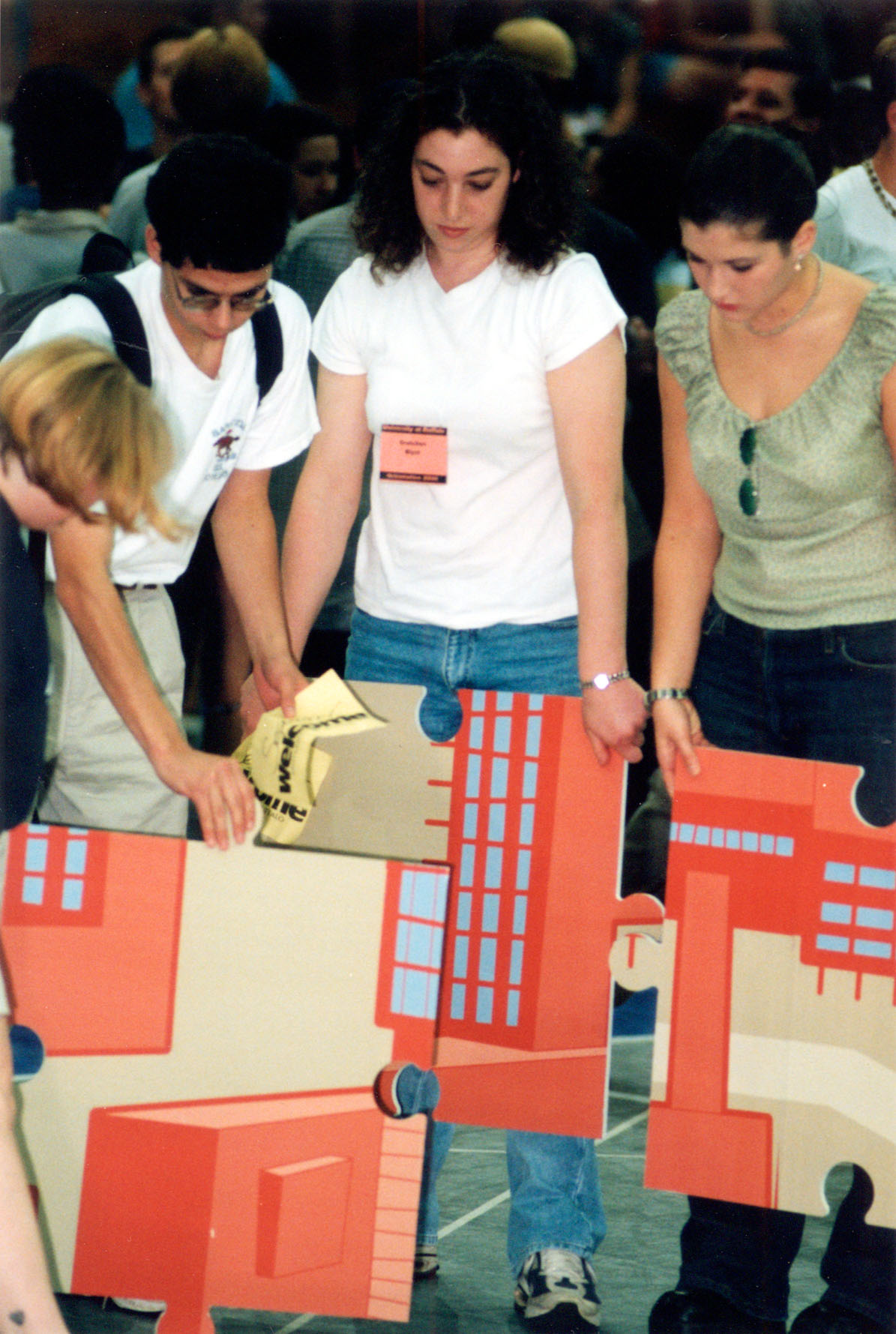 "We were looking for something fun that would break the ice and involve parents, students, faculty and administration in a collective activity," says Ricotta. "The puzzle is factual and informative in one sense, but more important, its assembly symbolically involves the entire campus community.