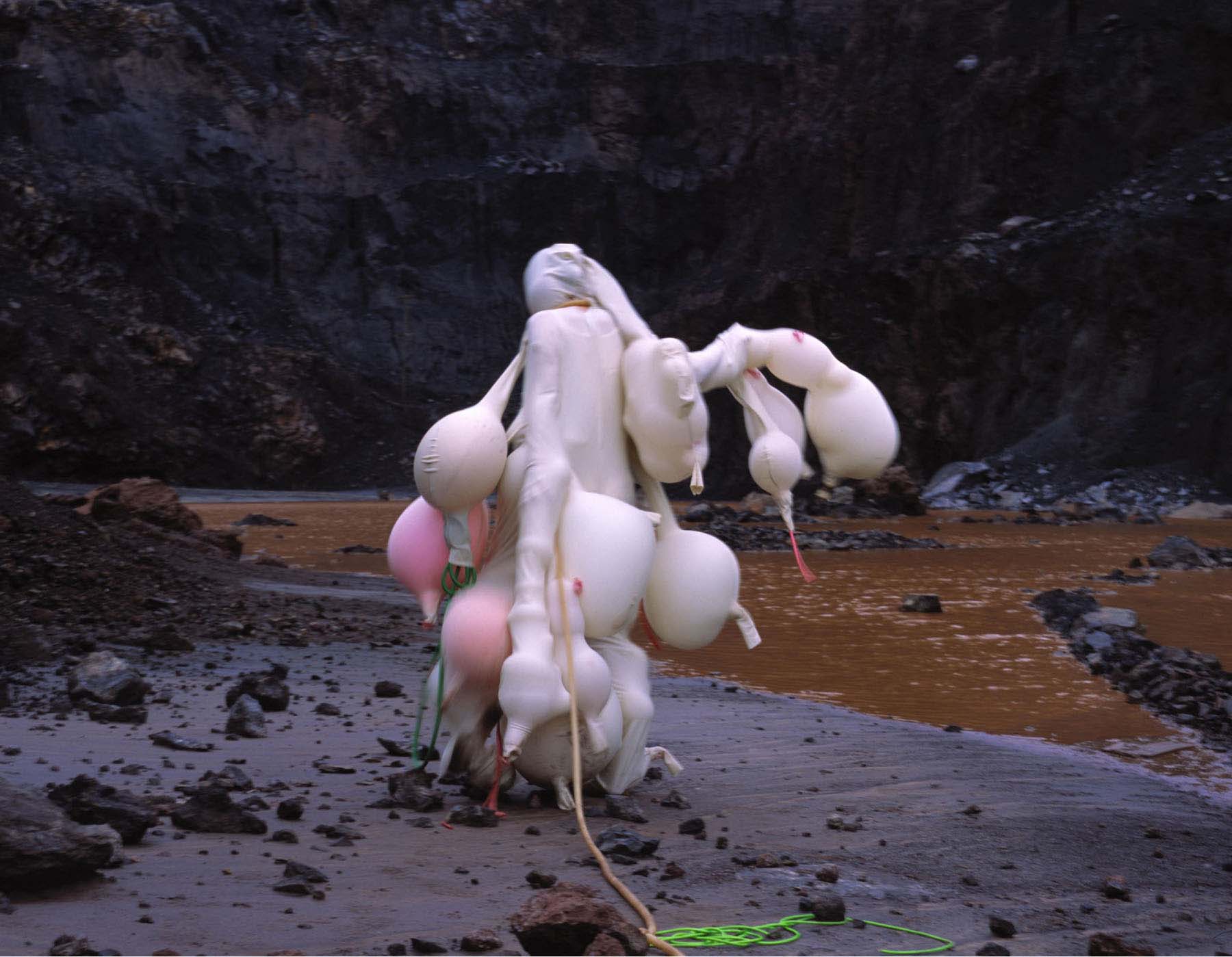 Included in the exhibition are examples of inert bodies -- as seen in the photographs from 100 Little Deaths, where the artist depicts herself prostrate in a variety of settings, which range from Amalfi and Montauk to the East Village and Flanders. Also included are videos and photographs of performers wearing costumes, fabricated out of inflated and water-filled condoms, balloons and latex, which are reminiscent of amphibious creatures and embryonic shapes.