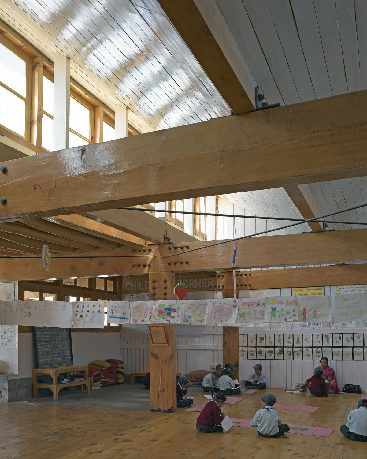 The walls of the Druk School therefore are not made of concrete, but of granite with a mud core, a traditional material that insures adequate insulation and offers natural appeal in the mountain setting.