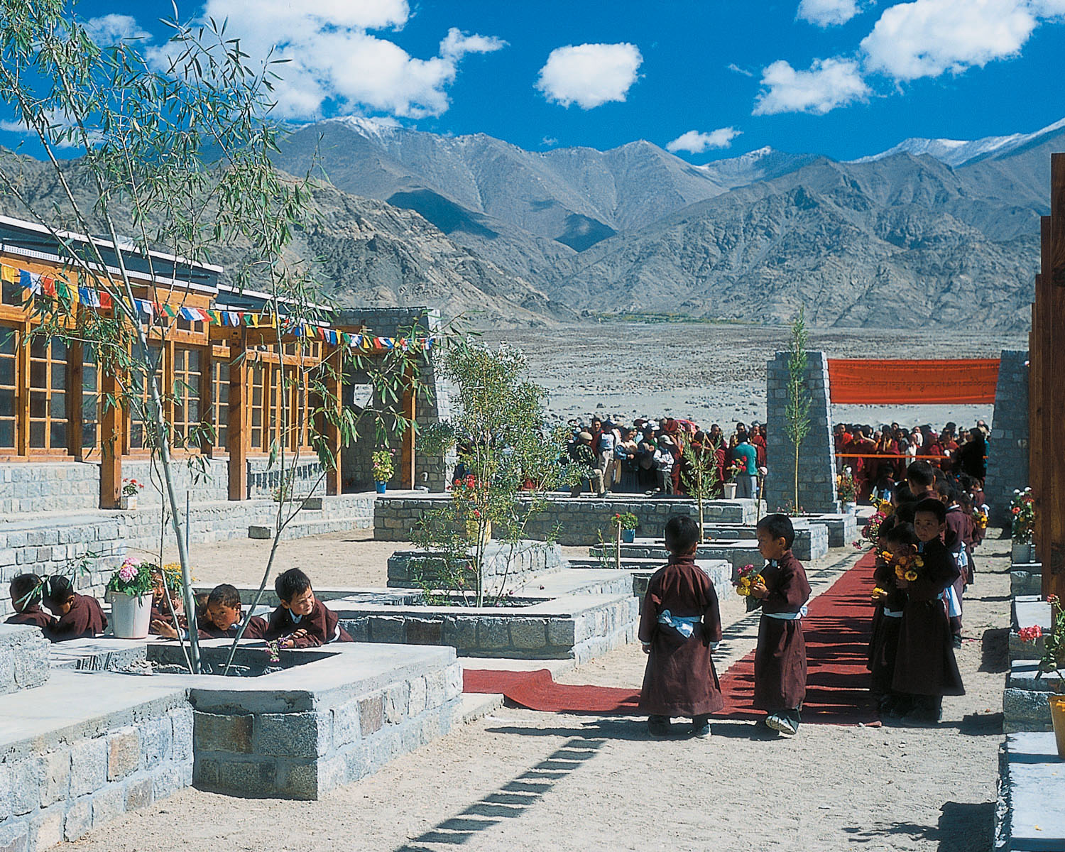 The school sits on the floor of one of Ladakh's magnificent valleys, and its buildings, which resemble a small town, rise in a breathtaking environment of snow-covered granite mountains, brilliant blue skies and bright greenery.
