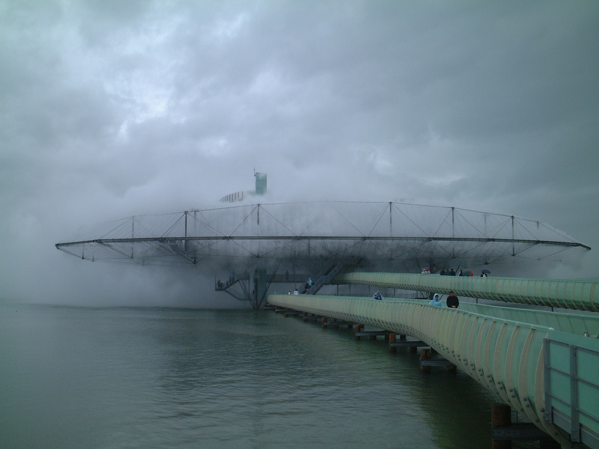 The lightweight structure houses 31,500 high-pressure mist nozzles that create a fog mass that defines the building. Water, in this sense, serves as the building material.