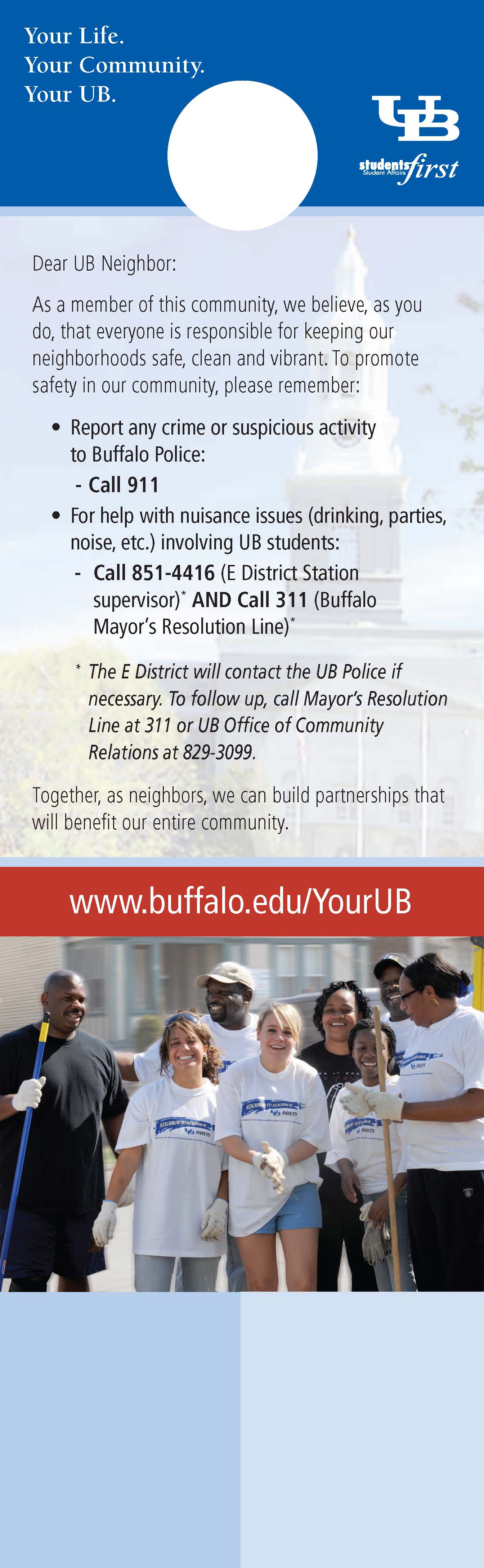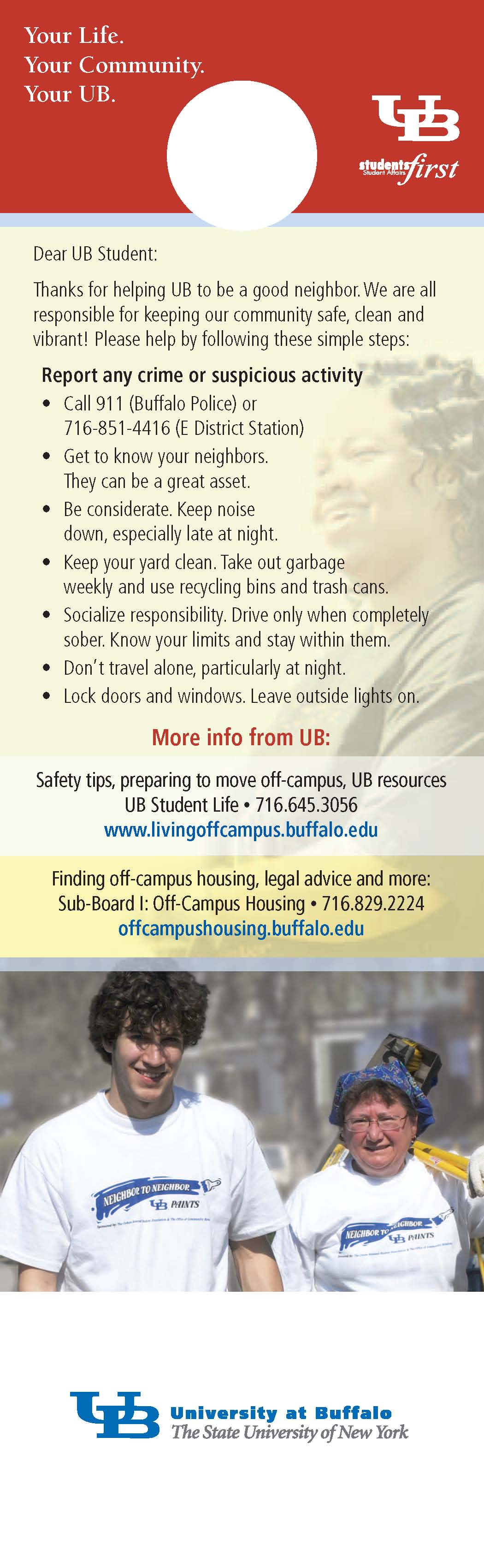 The double-sided doorhangers encourage students to "get to know their neighbors, be considerate and don't travel alone at night;" they also provide community members with contact information for UB's Community Relations Office and the Mayor's Resolution Line if there are safety or behavior issues that need to be addressed.