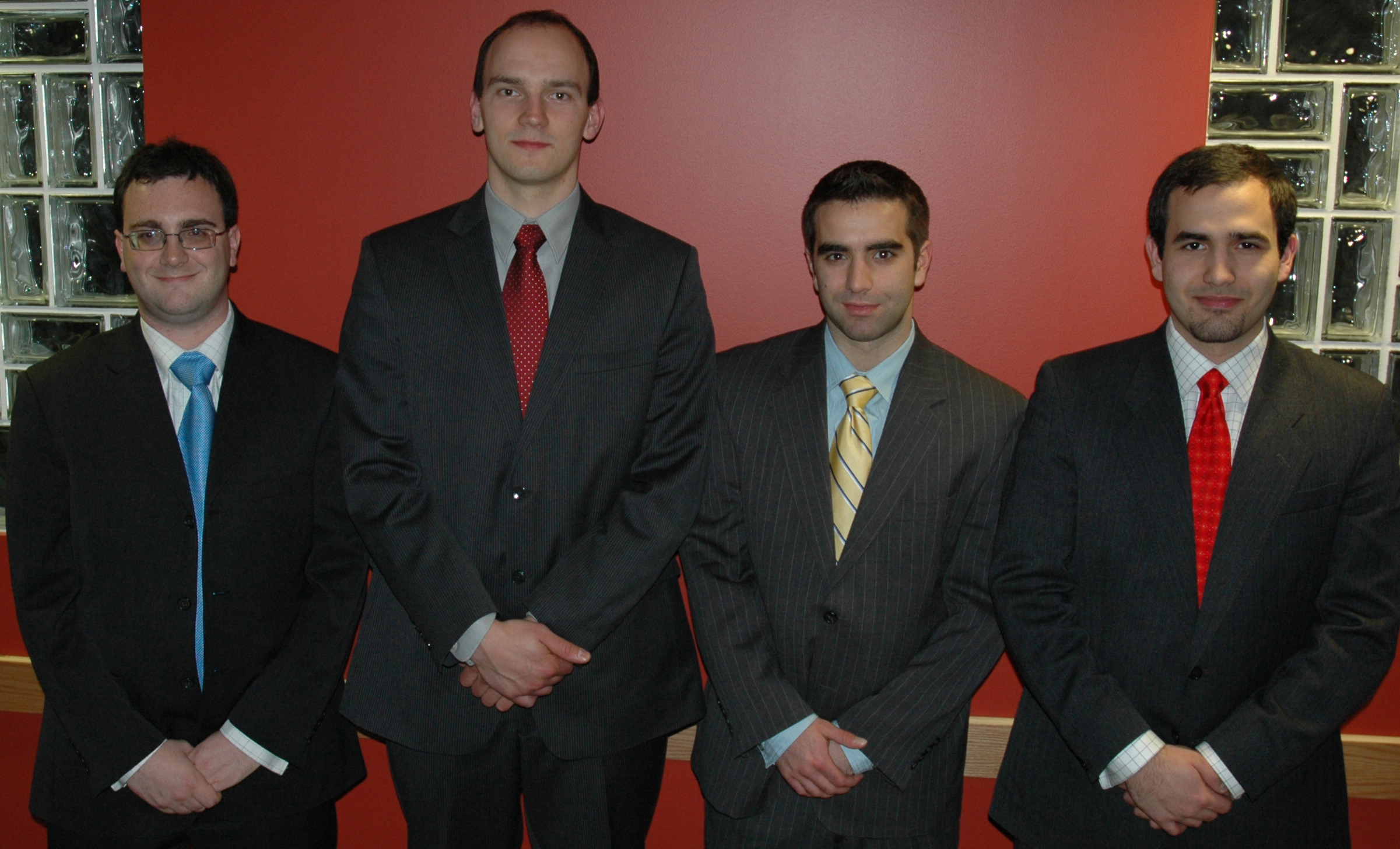 The winning team, Rehman Baig of Buffalo; Benjamin Nold of West Seneca; Robert Piaia of Washingtonville; and Peter Szalowski of Fairport, was chosen from among four teams of finalists who presented the results of their case analyses on Feb. 13 at the UB School of Management.