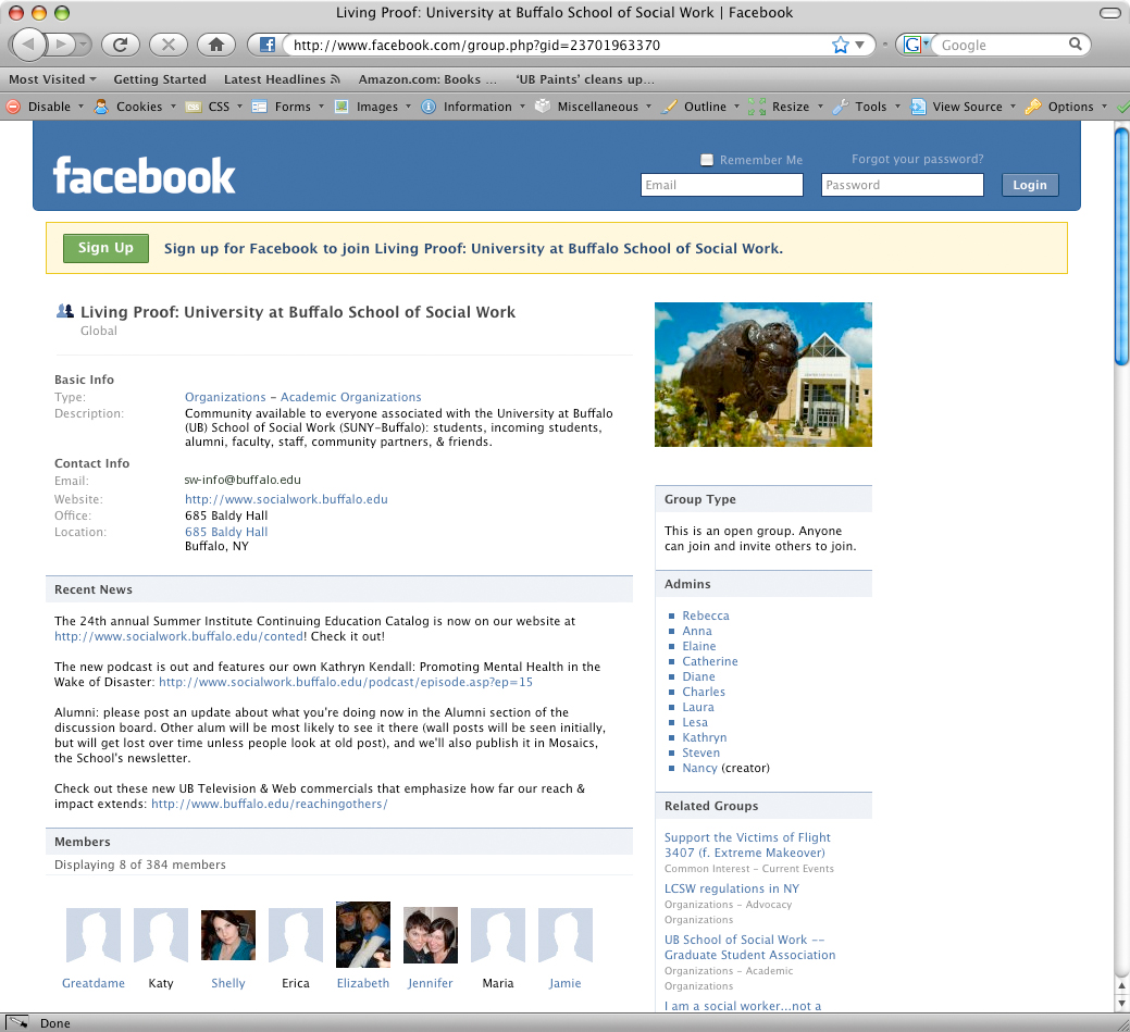 The school also nurtures its own active Facebook page. "Living Proof: University at Buffalo School of Social Work." Its creators saw it as a crossroads for current students, faculty, alumni and those who wanted to interact with these groups to network -- for everything from current research to professional contacts.
