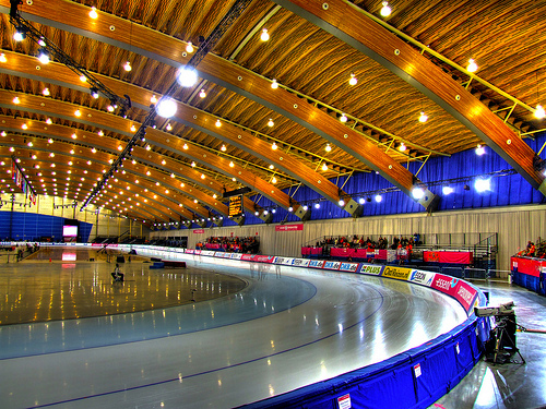 The Oval, which sits on the banks of Vancouver's Fraser River, will provide the long-track speed skating venue for the 2010 Olympic Winter Games. The building is vast and it is distinguished in particular by its elegant internal spaces that feature wood trusses and innovative ceiling panels.