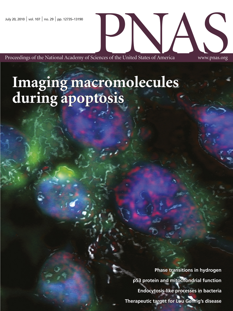 The resulting composite image integrates in one picture the information on all four types of biomolecules, with each type of molecule represented by a different color: proteins in red, RNA in green, DNA in blue and lipids in grey, as shown on the PNAS cover.