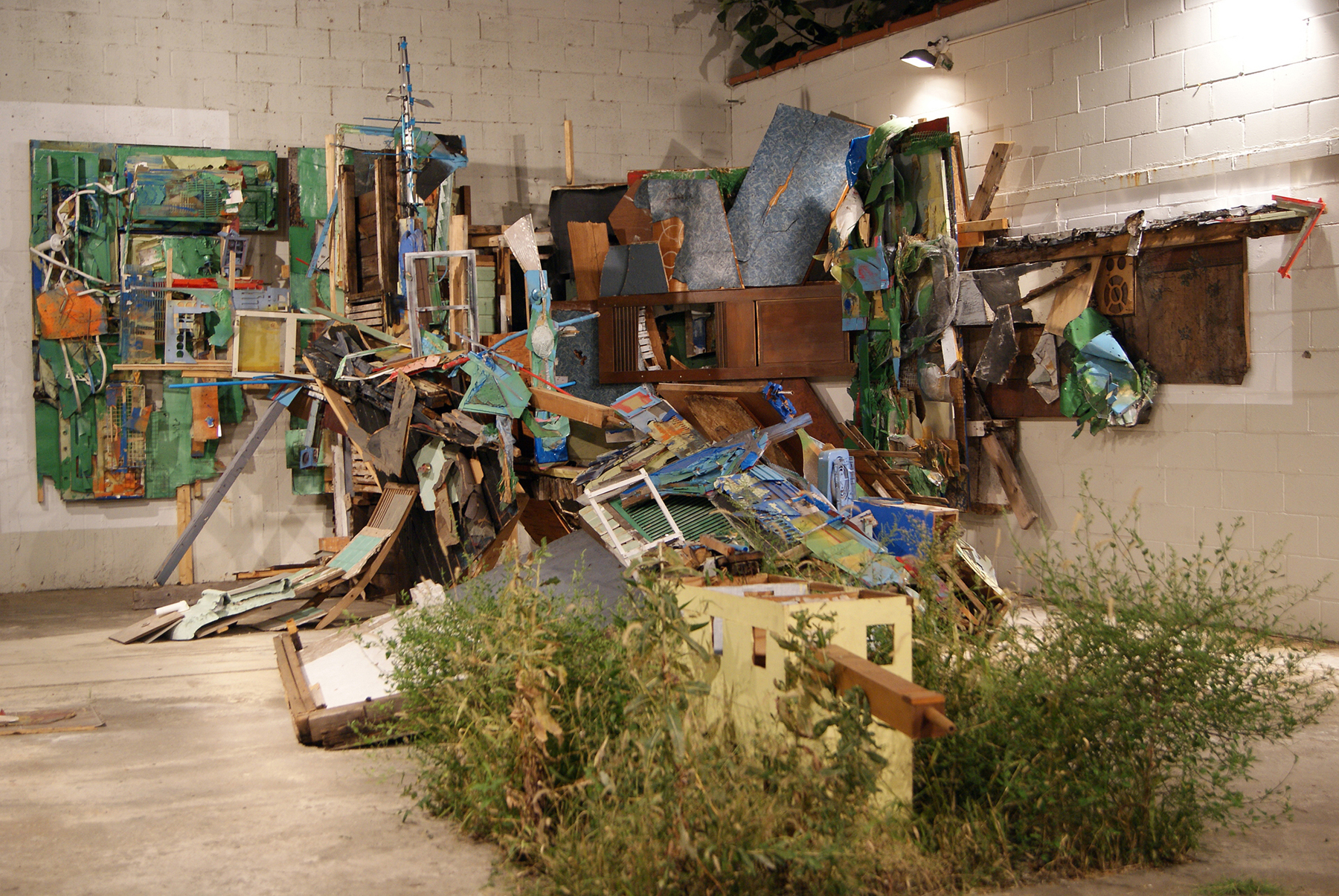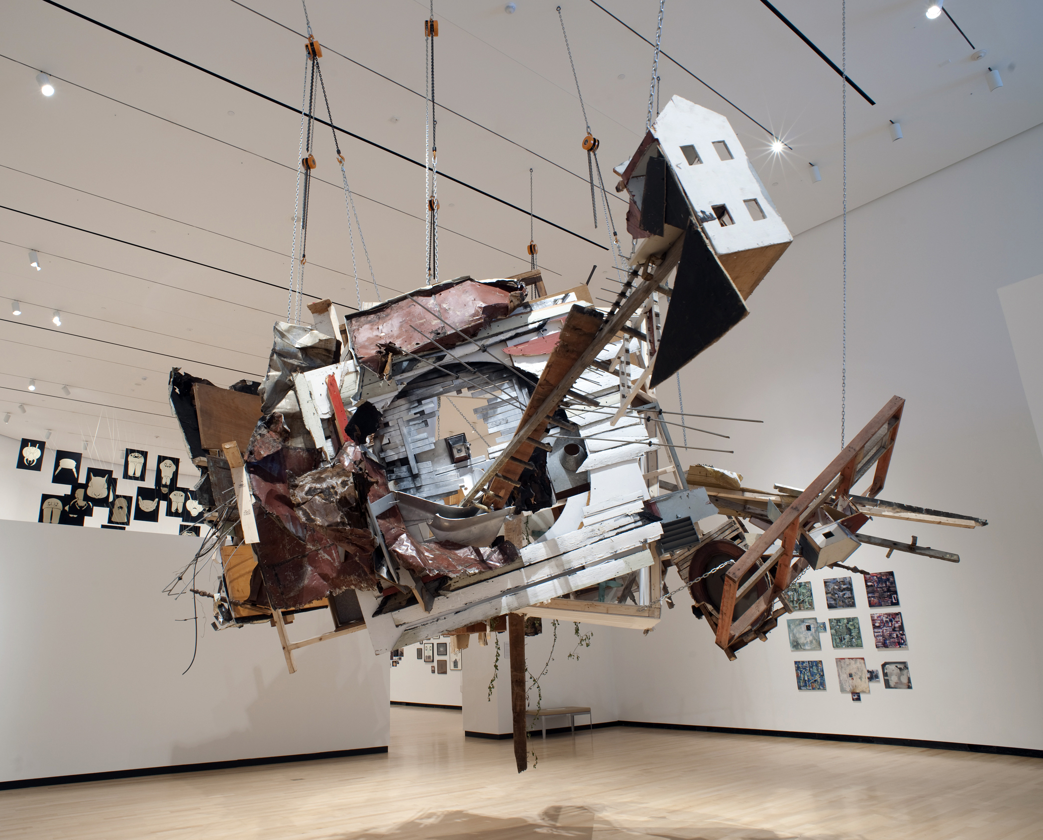His creations have an explosive quality, with wood paneling, broken doors and linoleum tiles bursting forth, in chaotic layers, from some undefined epicenter. In his Burchfield presentation, part of the multi-venue Beyond/In Western New York 2010 exhibition, the central sculpture hangs from the ceiling, an industrial-hued Goliath strung up with steel chains. A partly constructed room lies at the piece's core.