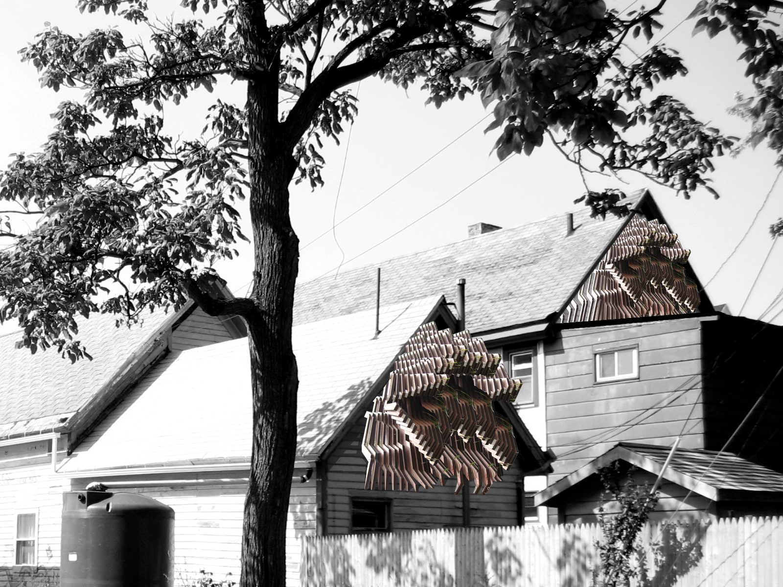 Some of Hwang's initial concepts for Pest Wall share a similar quality, with pieces of carved plywood—some shaped like lightning bolts—cascading down the sides of buildings in tightly spaced layers.
