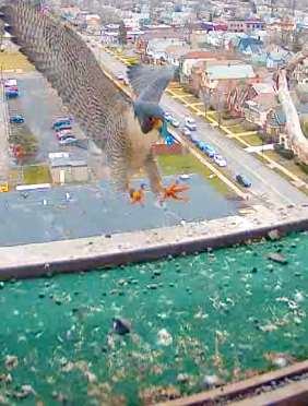 That contrasts with the parents who are expected to remain at their UB nesting box for many years; they also don't leave in the winter, Adams explains, most likely because of Western New York's abundant waterfowl, which provides the bulk of the diet for peregrine falcons.