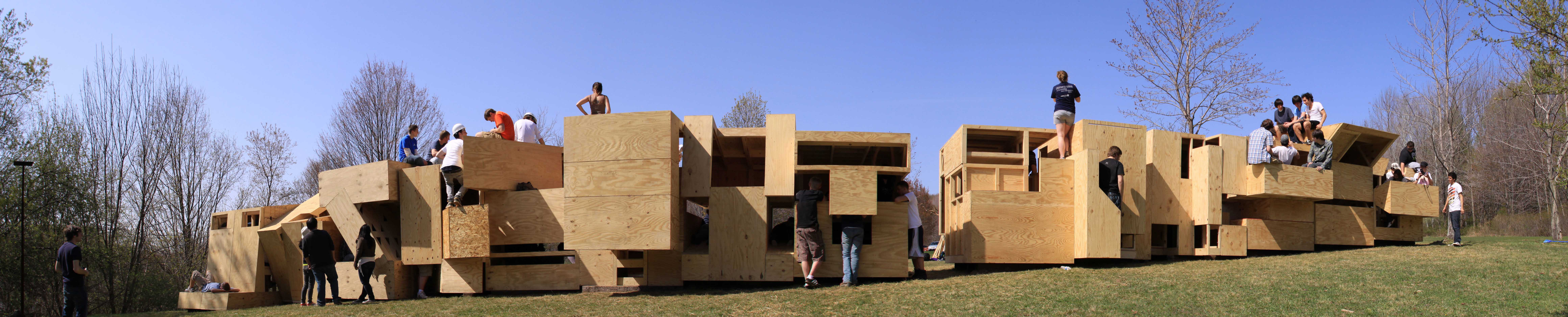 BUFFALO, N.Y.-- Freshman architecture students from the University at Buffalo have designed and are building a 96-foot-long string of wooden micro-dwellings that will open to the public later this month at Griffis Sculpture Park. Assembly of "The Living Wall" will conclude the week of April 25.