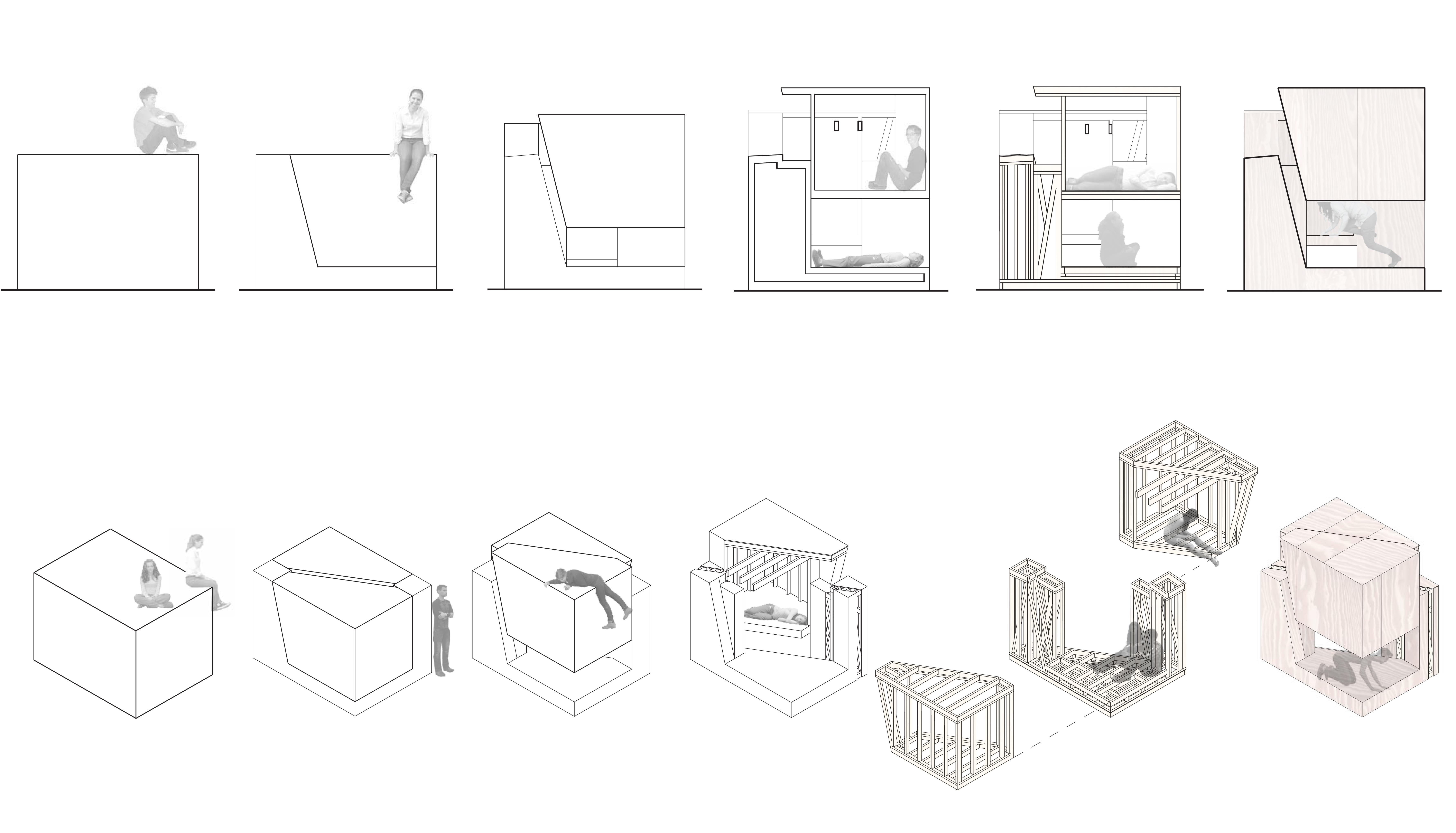 Working in groups of six to seven, about 80 students were tasked with creatively transforming uniform, wooden volumes measuring 6 by 6 by 8 feet to incorporate an entrance, day lighting, natural ventilation, and a minimum of five sleeping spaces.