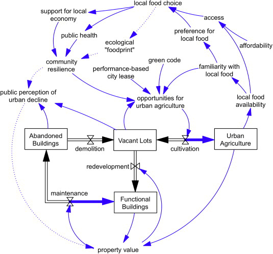 The map shows feedback involving land use, showing how vacant lots represent an opportunity for urban agriculture, how urban agriculture can increase familiarity with local food, and how that familiarity can result in greater support for the cultivation of vacant lots into urban farms.