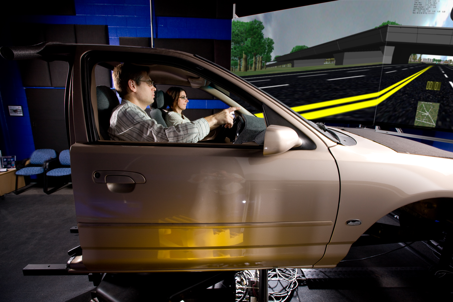 The driving simulator consists of a "car" mounted on a six-degree-of-freedom motion base that realistically simulates the sensations of turning, braking and traveling up- or downhill. The cabin is outfitted with high-performance simulation controls, such as a steering wheel, accelerator, brake and clutch pedals, all of which combine to make the experience extremely authentic. While the platform is moving, four 10-by-8-foot display screens surround the car, simulating the world that the drivers are experiencing.