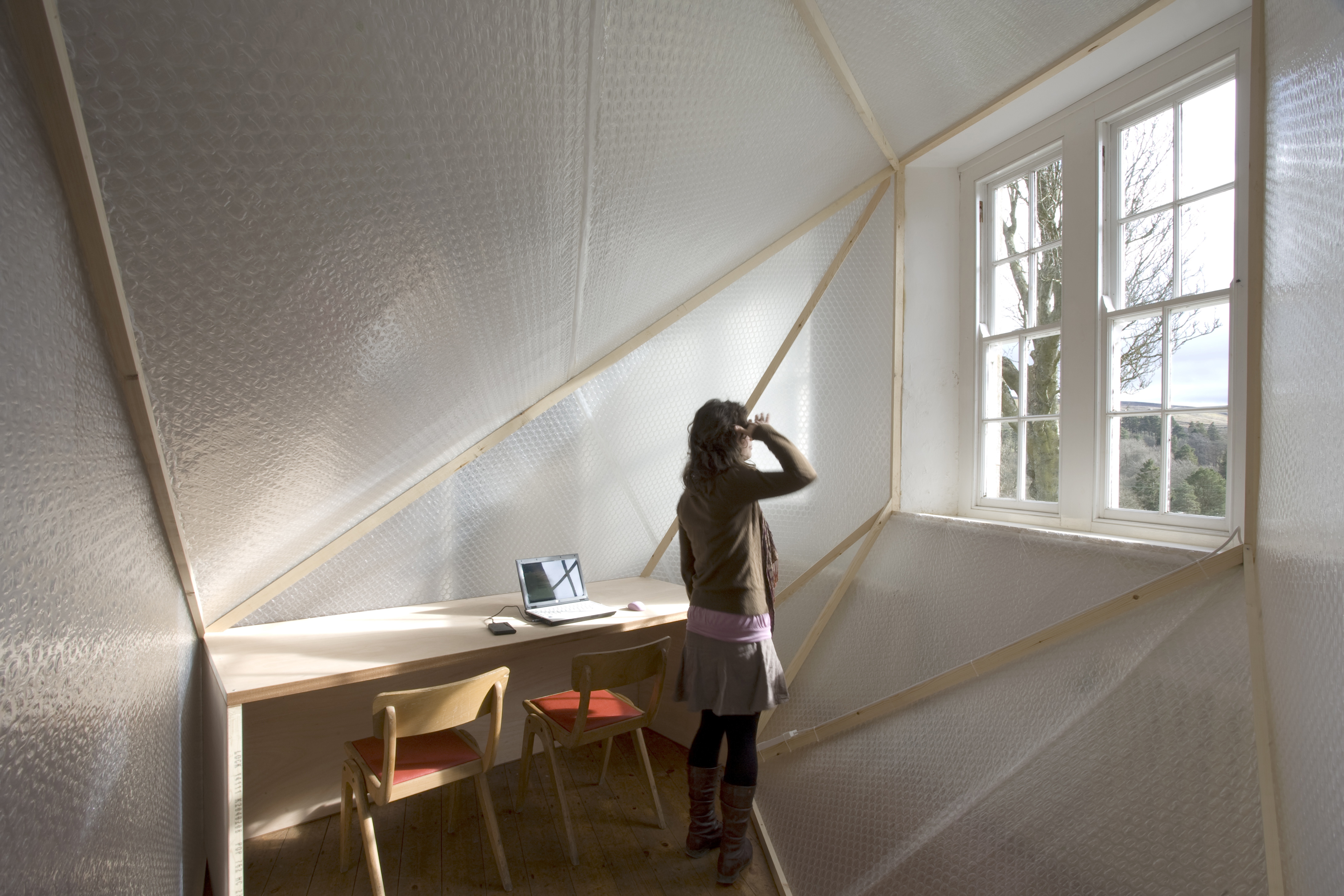 They employed simple wooden frames covered with two-ply bubble wrap (normally used to insulate greenhouses) to construct small, naturally lit and attractive sealed pockets of warmth within which artists can work.