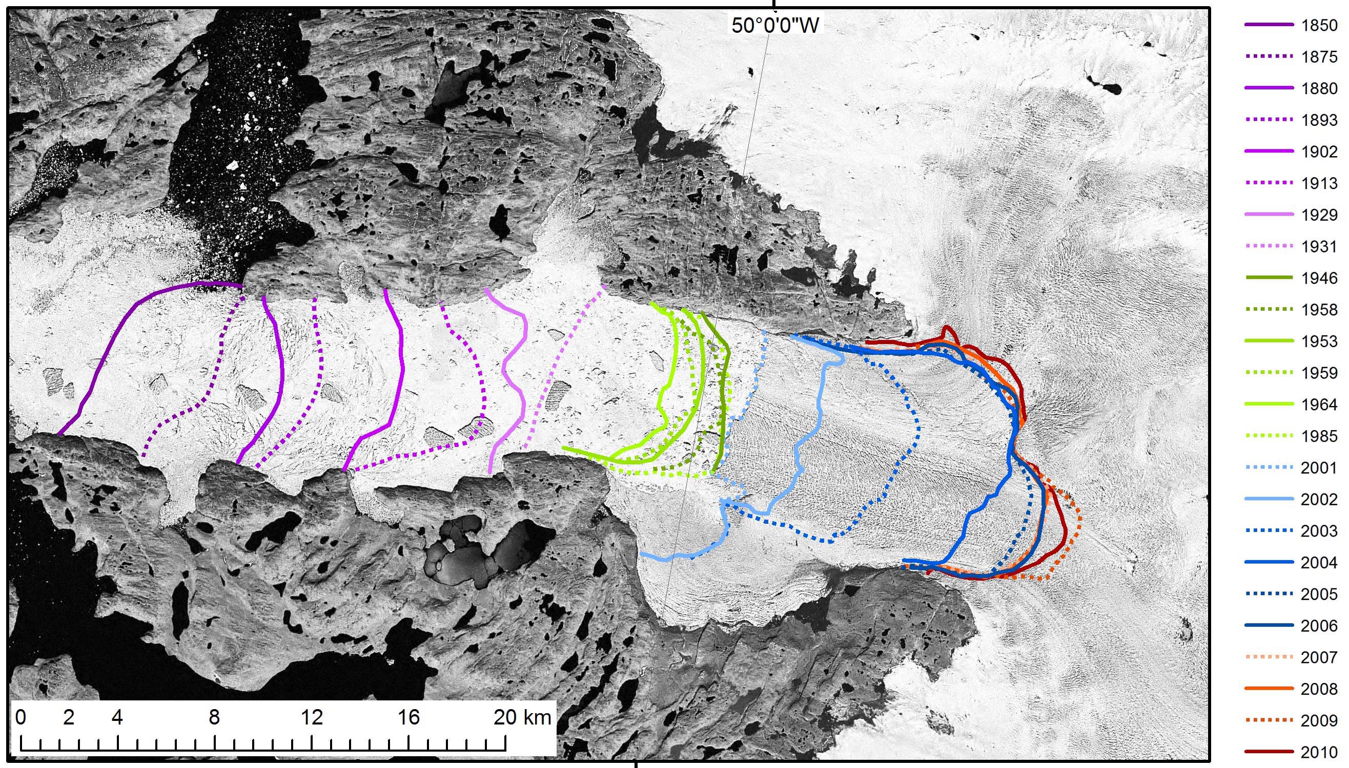 The decline of Jakobshavn Isbrae between 1850 and 2010 has been well-documented through aerial photographs and satellite photographs by UB Associate Professor of Geology Bea Csatho, which show the ice shrinking rapidly from west to east along a narrow fjord.