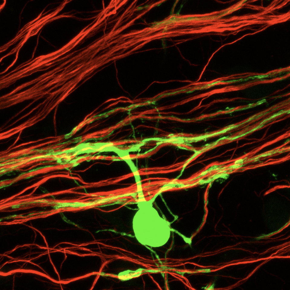 Myelin is the crucial fatty material that wraps the axons of neurons and allows them to signal effectively. Normal nerve function is lost in demyelinating disorders, such as MS and the rare, fatal, childhood disease, Krabbe's disease.