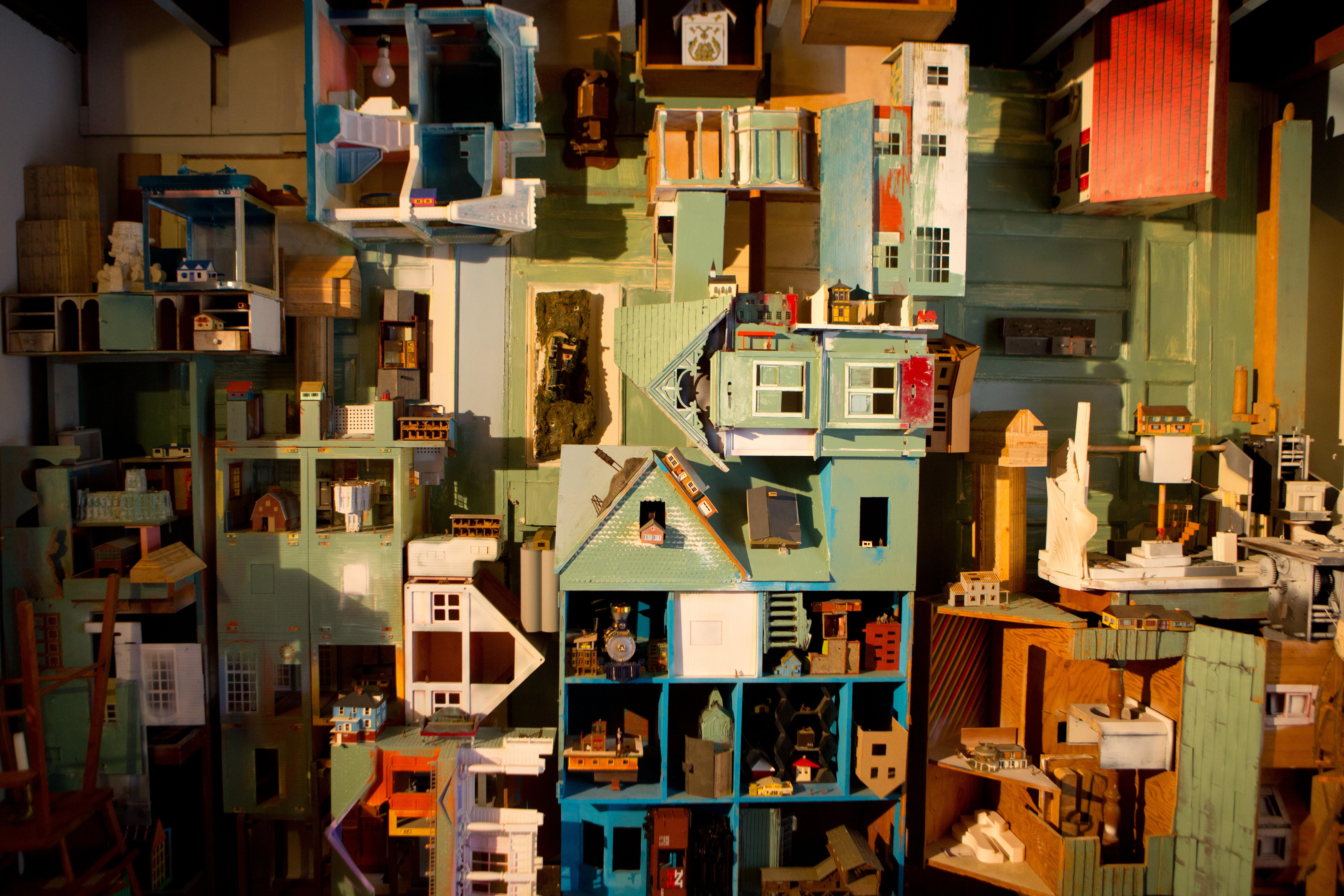 In the dining room, a city is rising. A panoply of dollhouses climbs up one wall, sheltering curios like model churches, miniature barns, vintage train sets and shovel-wielding construction worker figurines.