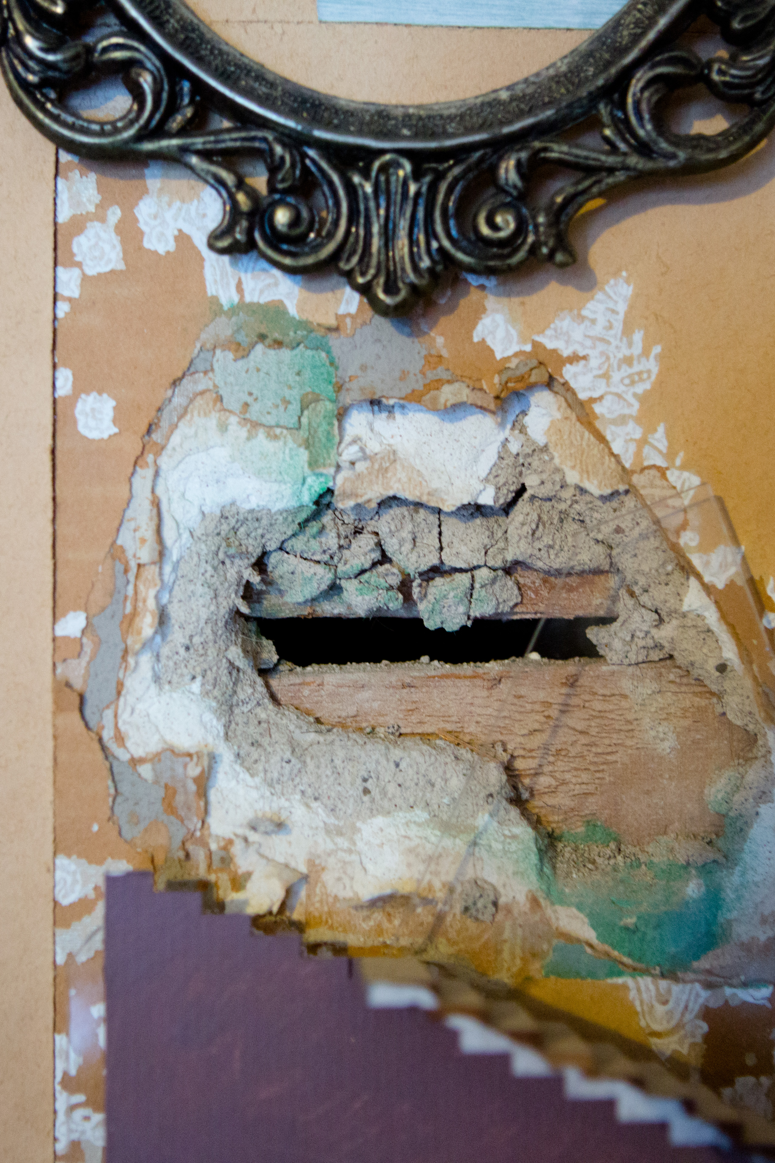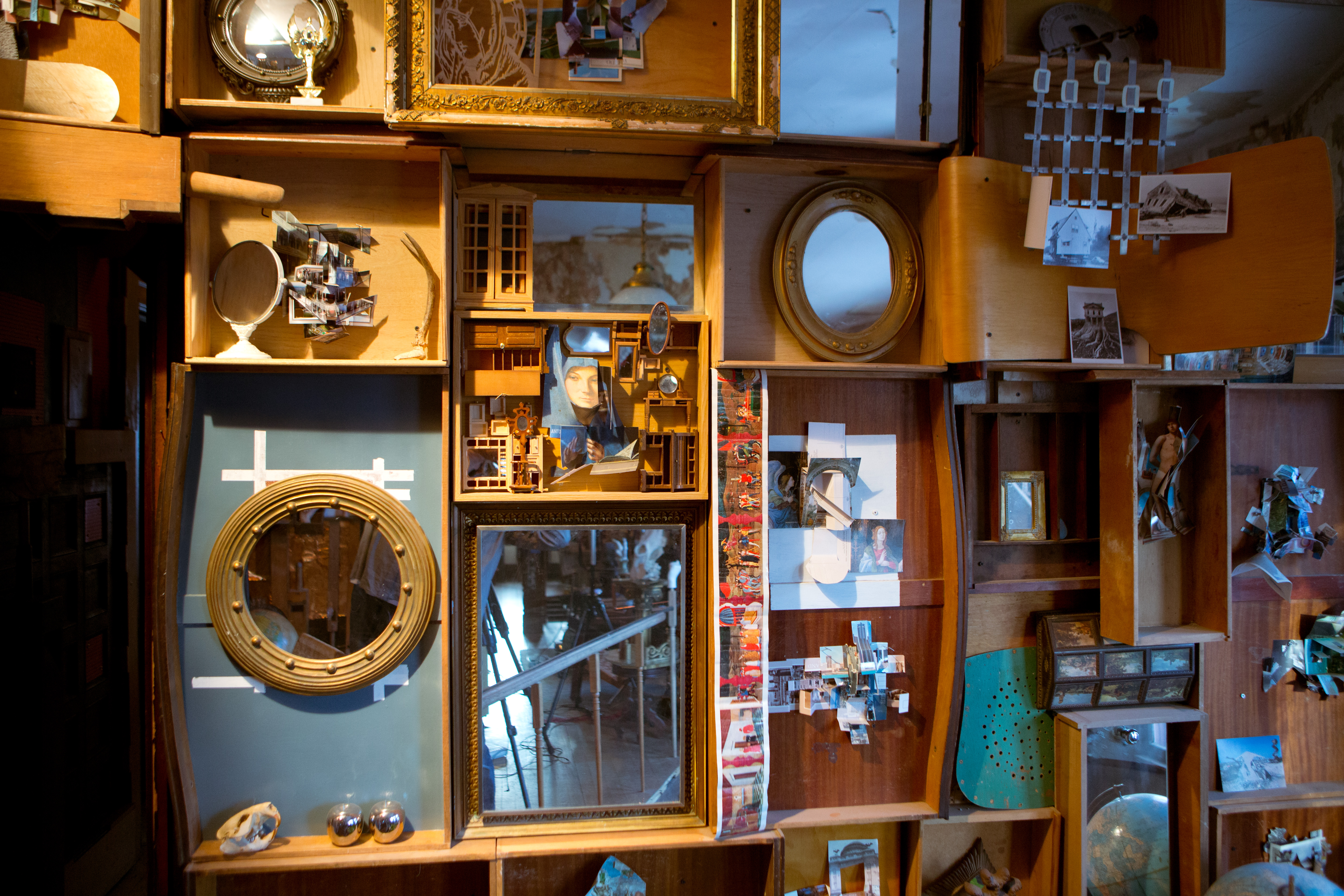 “Many of the objects that I collect are house-like: bird cages, jewelry boxes, dollhouses, things that seem to suggest shelter or enclosure. They get absorbed into the walls and start creating fictitious cityscapes, unknown structures that inspire the imagination,” Maher says. “I love the idea of a secret box that promulgates other openings, that acts as a catalyst for creativity.”