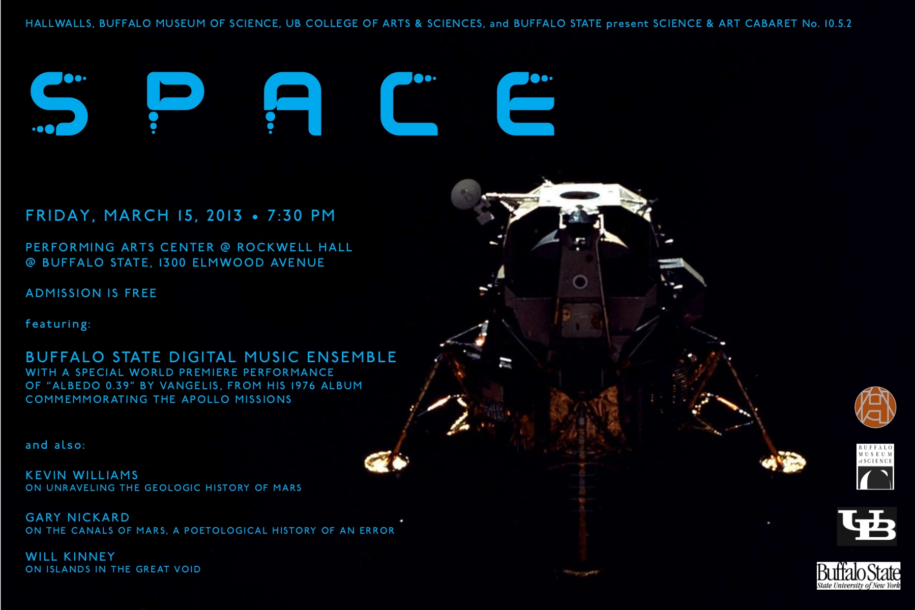 “Space” is a special event in collaboration with SUNY Buffalo State. After successful off-site showings at the Hauptman Woodward Medical Research Institute and Rockwell Hall, the Science & Art Cabaret will return to its home base of The Ninth Ward at Babeville for the final cabaret of the season, “Nothing,” in late April.