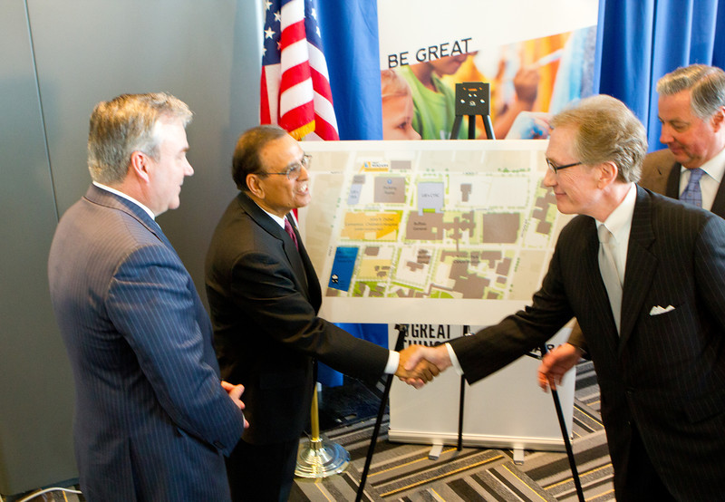 UB President Satisk K. Tripahi (second left) and Gary N. Crosby, interim president and CEO of First Niagara, greet one another as Daniel E. Cantara III (far left), First Niagara senior executive vice president, and Michael E. Cain, MD (far right), UB vice president for health sciences and dean of the School of Medicine and Biomedical Sciences, look over a map indicating where UB’s new medical school will be built.