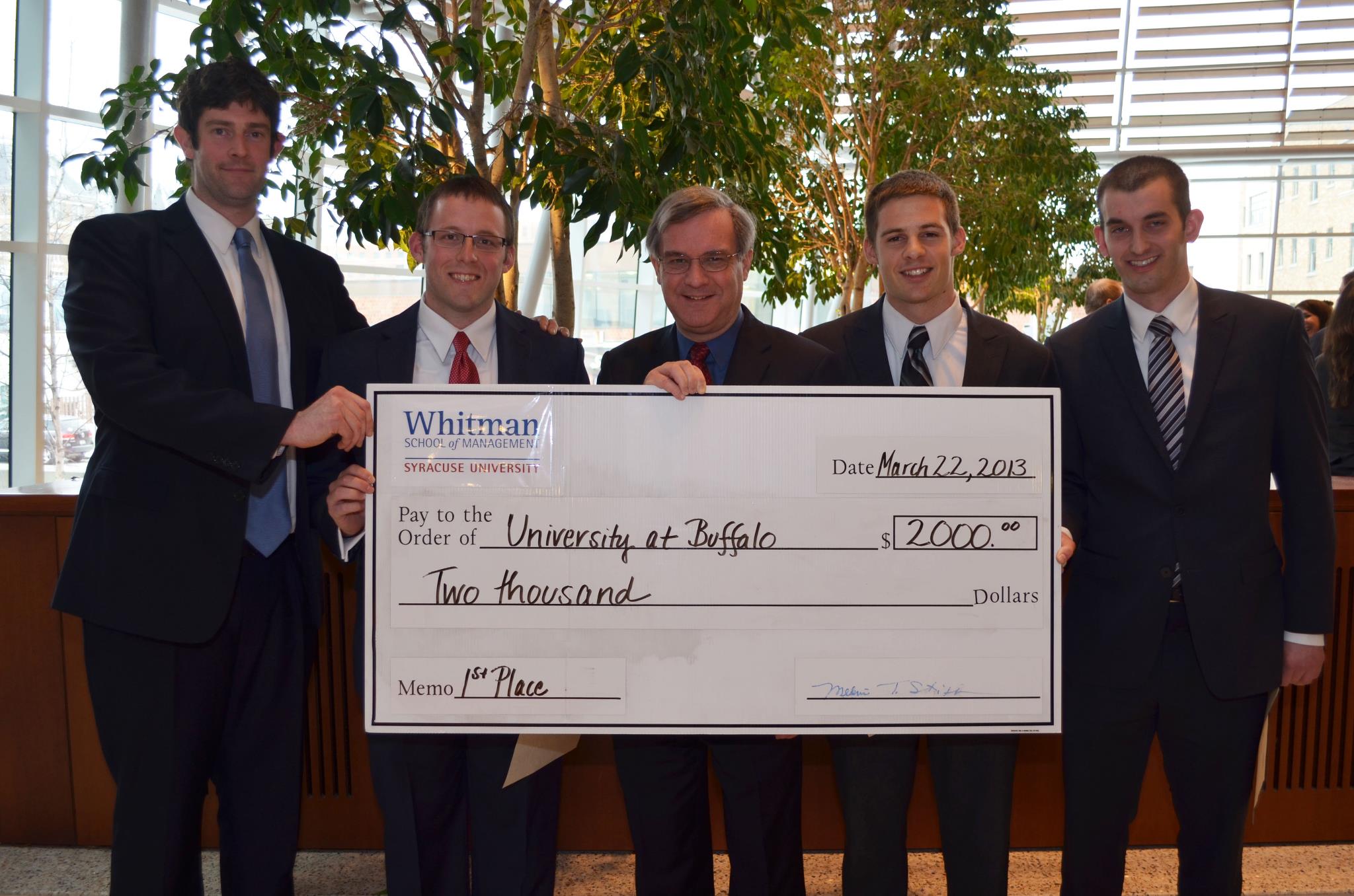 Don Harter, associate dean of master’s programs at Whitman, presented the winners’ check and a certificate of achievement to the UB School of Management team.