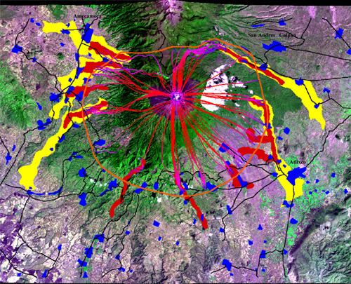 A: I participated in drafting two maps of Popo. The first map was completed in 1995 by an international team during the first months of the volcanic crisis. In 2000 we made a second map using computers to simulate small- and intermediate-sized mud flows at Popo because this appeared to be one of the important hazards that would develop with time. Using this information, we created a map showing where mud flows might travel during an event.