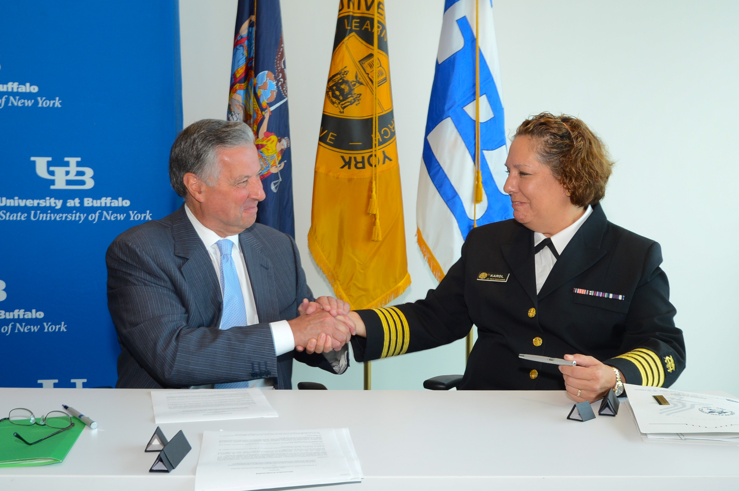 Michael Cain, UB vice president for health sciences, and Susan Karol, chief medical officer for the Indian Health Service, sign a memorandum of understanding establishing a collaborative relationship between the two institutions.