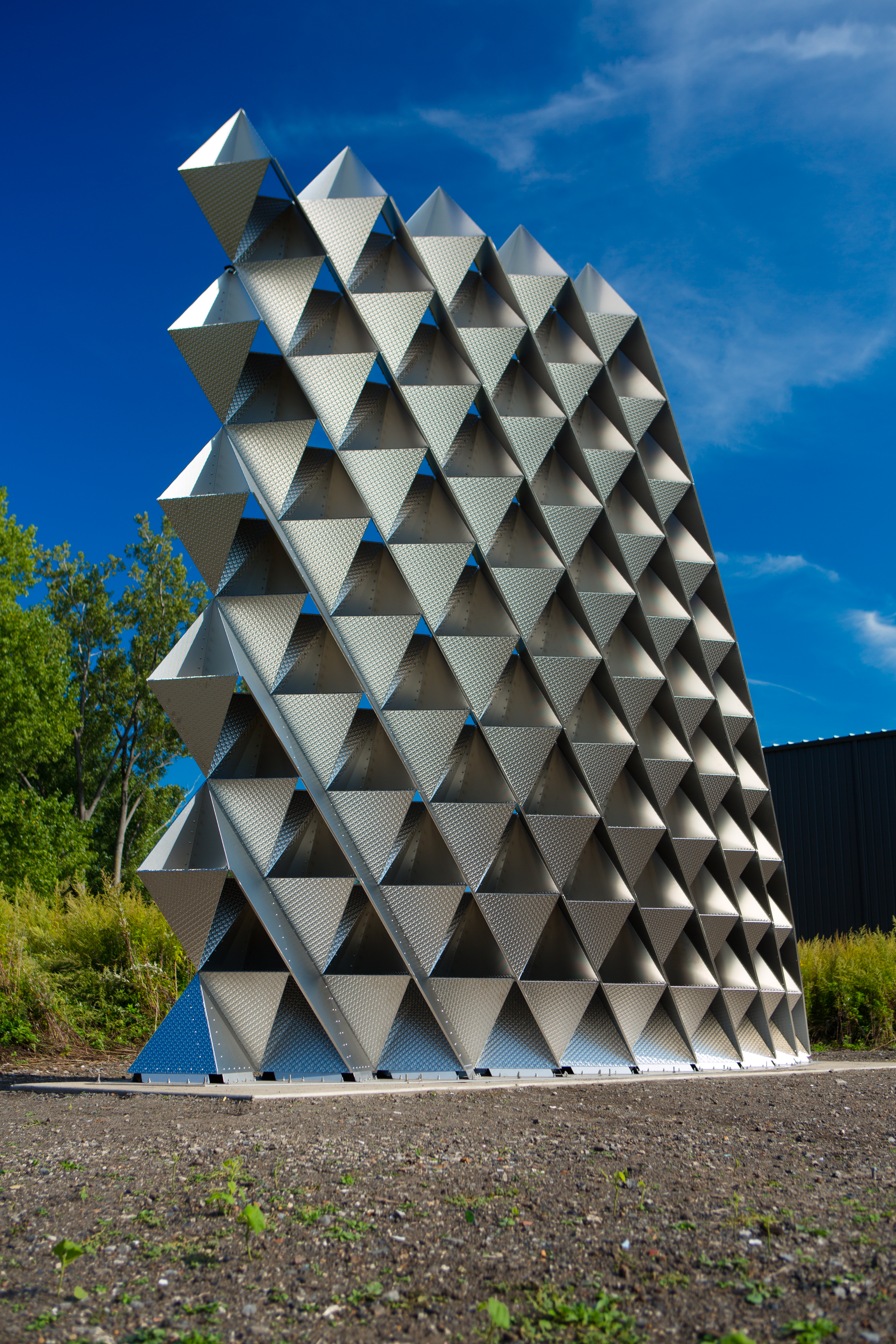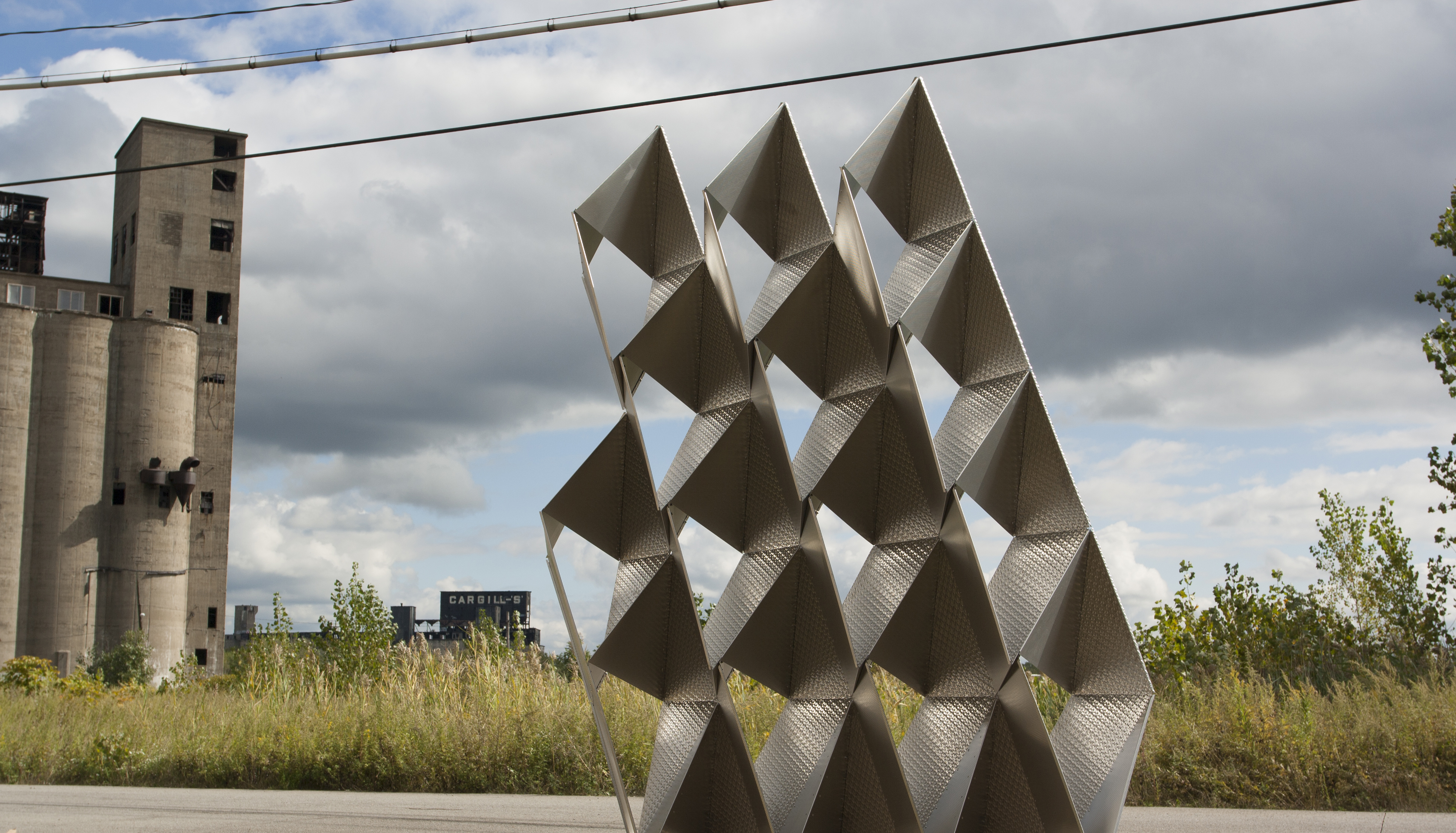 3xLP is similar to 2XmT, a wall that the partners erected this summer near the entrance to Silo City, a cluster of grain elevators along the Buffalo River. The architects entered 2XmT in the first phase of the TEX-FAB competition, then revised their entry to focus on 3xLP after becoming finalists. In contrast to 2XmT, 3xLP is porous, containing geometric spaces through which air and light can pass.