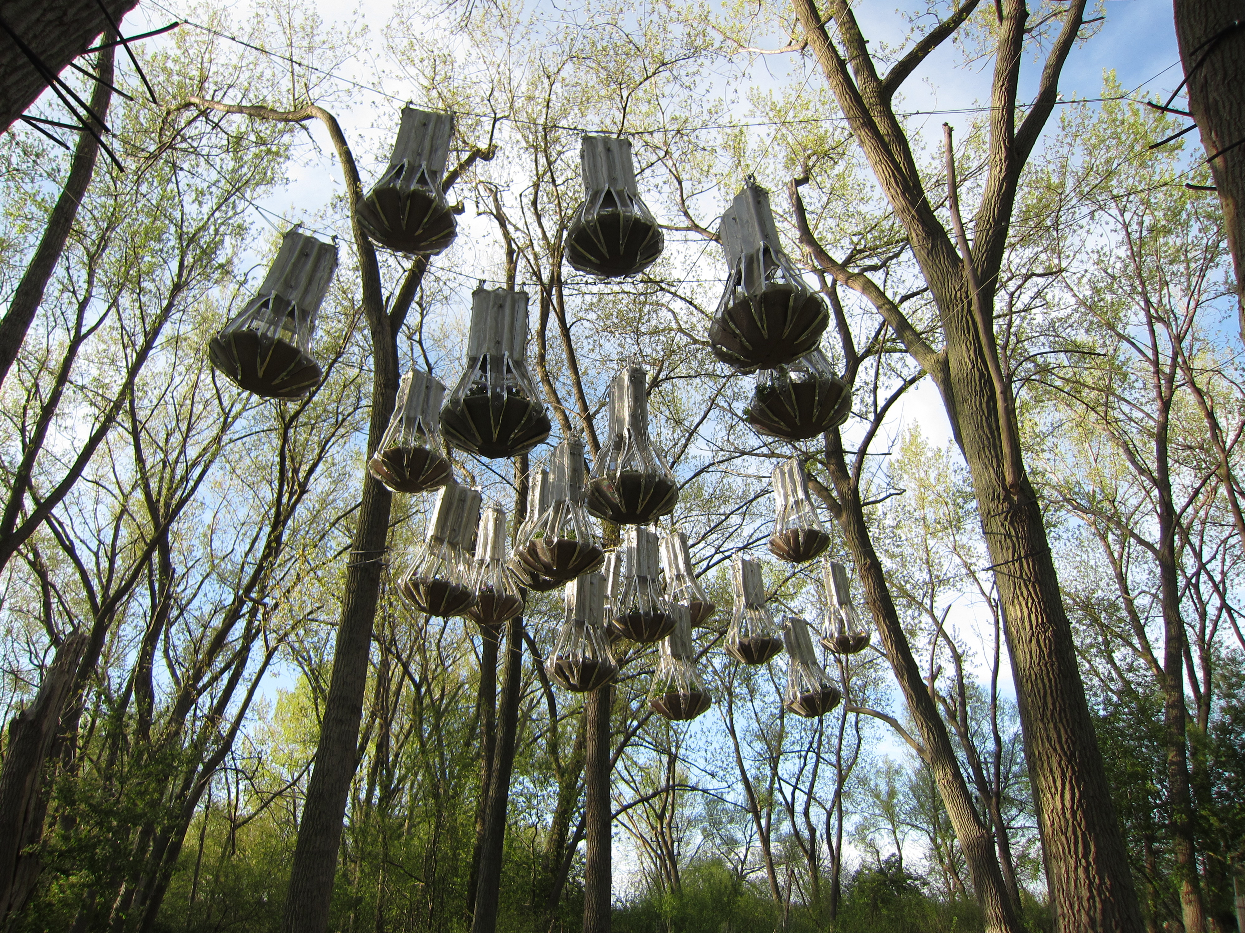 Recent works by Hwang include Bat Cloud, a cluster of stainless steel mesh pods suspended from trees in Buffalo’s Tifft Nature Preserve. Bats can roost and feed in the pods, which are filled with soil and native plants. From below, the shimmering installation resembles a cluster of roosting bats.