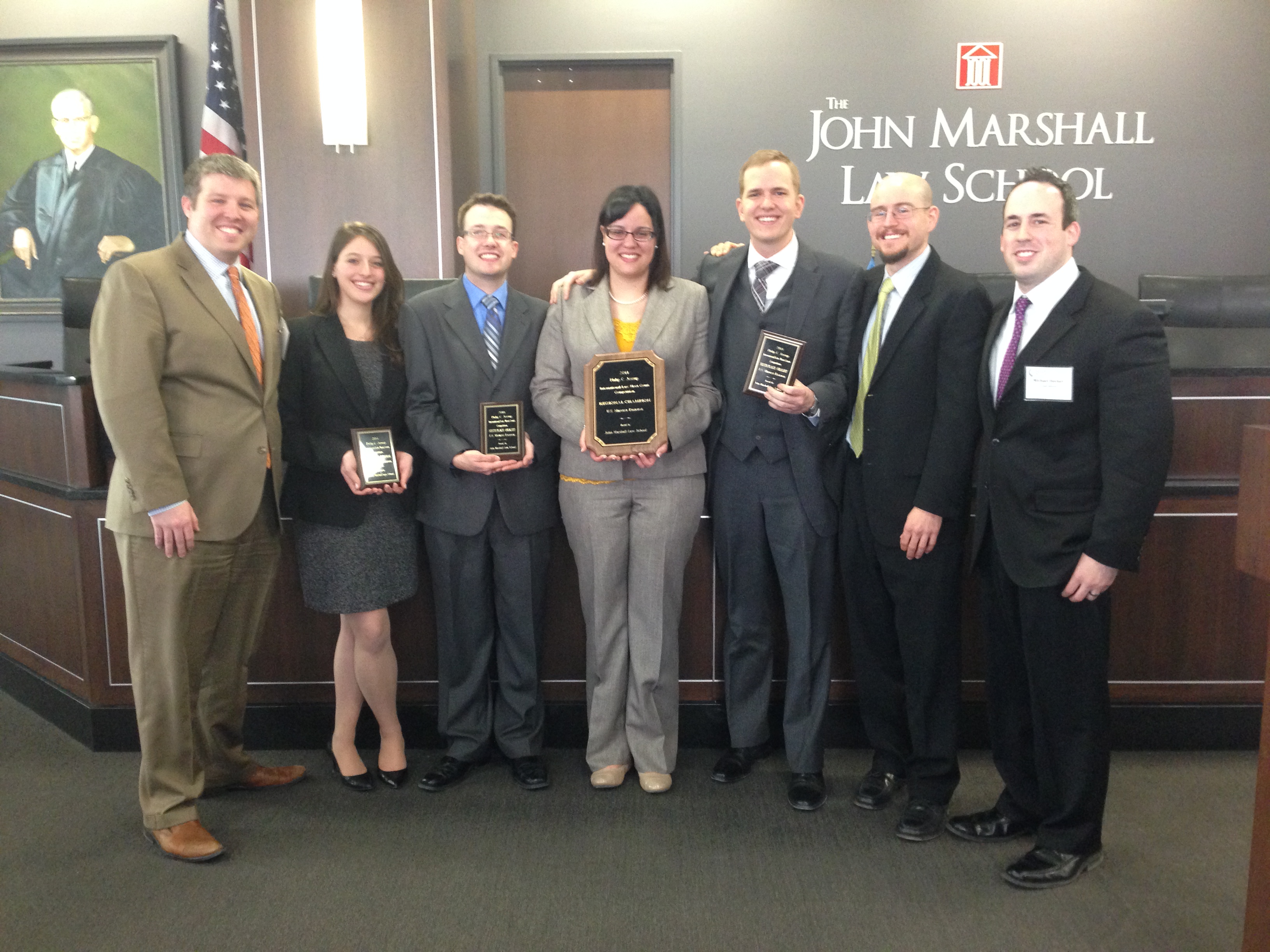 Winners of the Midwest Super Regional Round of the Phillip C. Jessup International Law Moot Court Competition are, from left: Kevin Espinosa ’09, Stephanie Forman (2L), Henry Zomerfeld (3L), Jessica Noto (3L), Andrew Dean (3L), John Land (3L), Michael Hecker ’09.