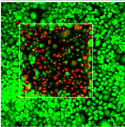 The laser irradiated area (the white square) shows live cancer cells (green) as well as dead cancer cells (red) as a result of the irradiation.