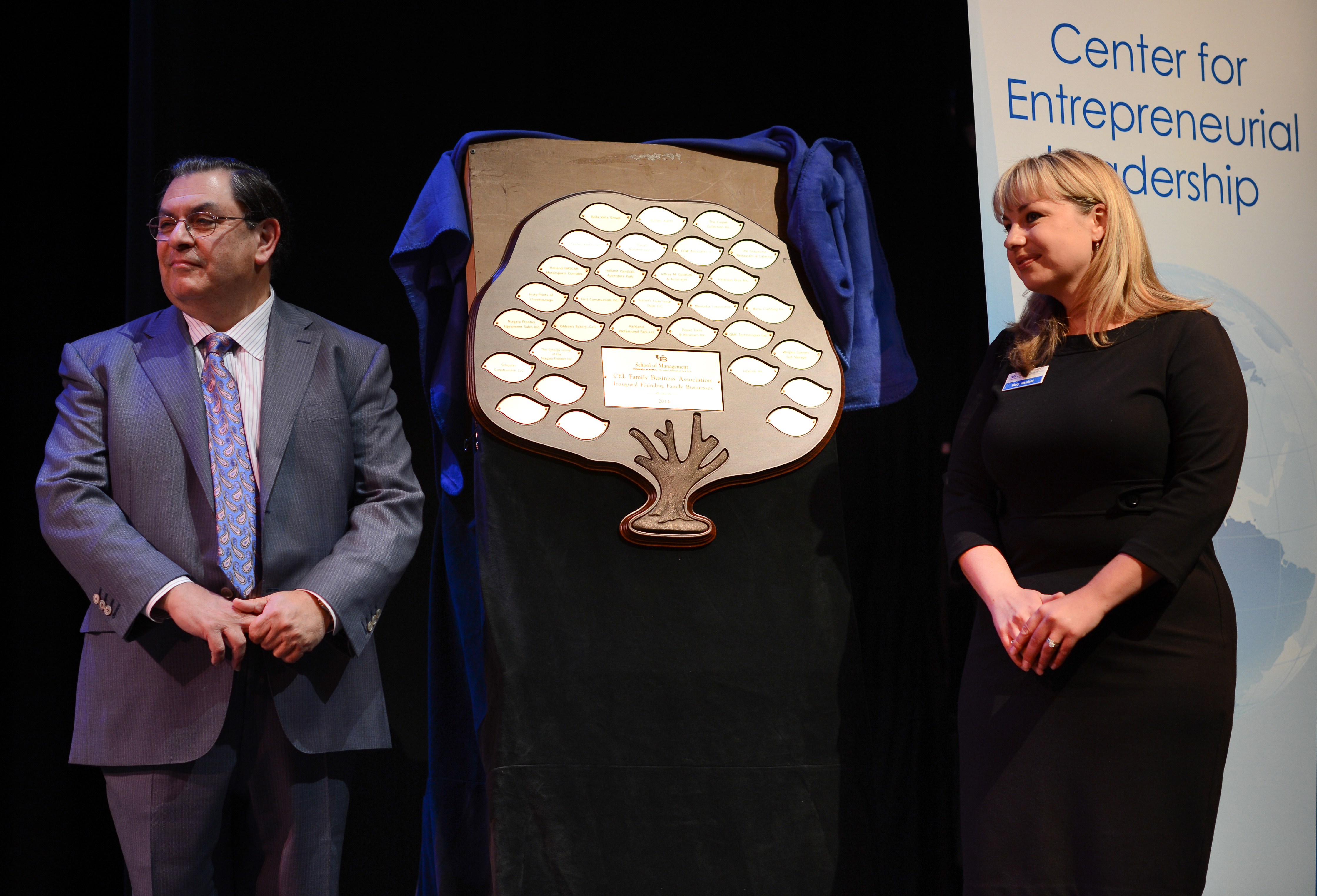 At the graduation ceremony, Arjang Assad, dean of the UB School of Management, and Mary Nicoletti, senior program coordinator for the Center of Entrepreneurial Leadership, unveiled a plaque honoring the inaugural members of the CEL Family Business Association. (Photo by Nancy J. Parisi)