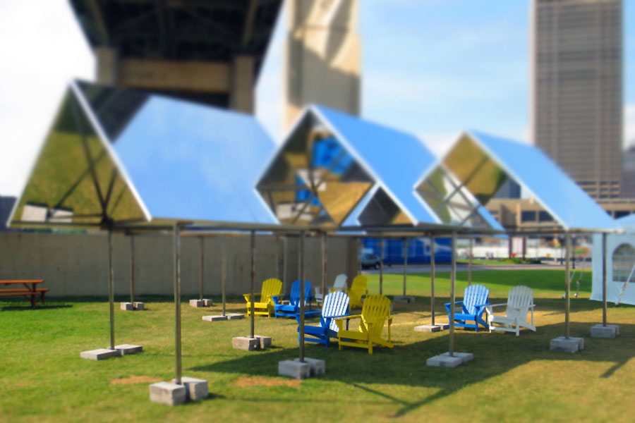 MirrorMirror was developed by Davidson, clinical assistant professor of architecture, and Rafailidis, assistant professor of architecture, through their Buffalo-based practice, Davidson Rafailidis. It was the winning entry for the 2013 IDEAS CITY StreetFest Tenting Competition, which asked an international field of designers to reimagine temporary street tents as provocative spaces for the public to gather and interact. That competition was sponsored by the Storefront for Art and Architecture and New Museum in collaboration with Architizer.