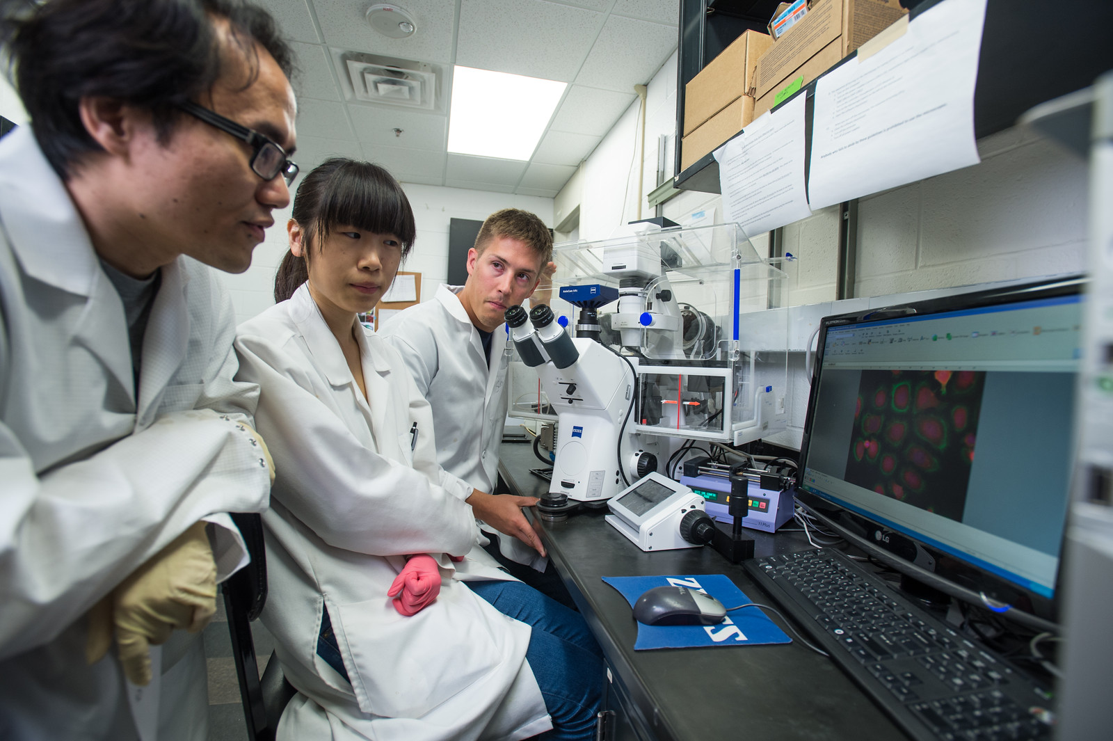 University at Buffalo researchers, including Charles Jones, far right, a doctoral candidate in the Department of Chemical and Biological Engineering, are developing new technology to improve DNA vaccines. Credit: Onion Studio.