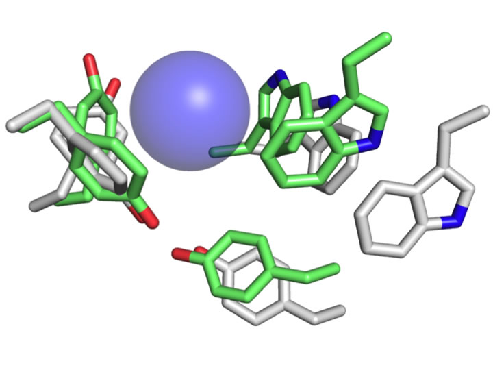 Closeup view of acetylcholine receptors shows two different kinds of binding site (green and white) studied by the UB researchers. The blue ball is the surface of the active part of acetylcholine (the neurotransmitter).