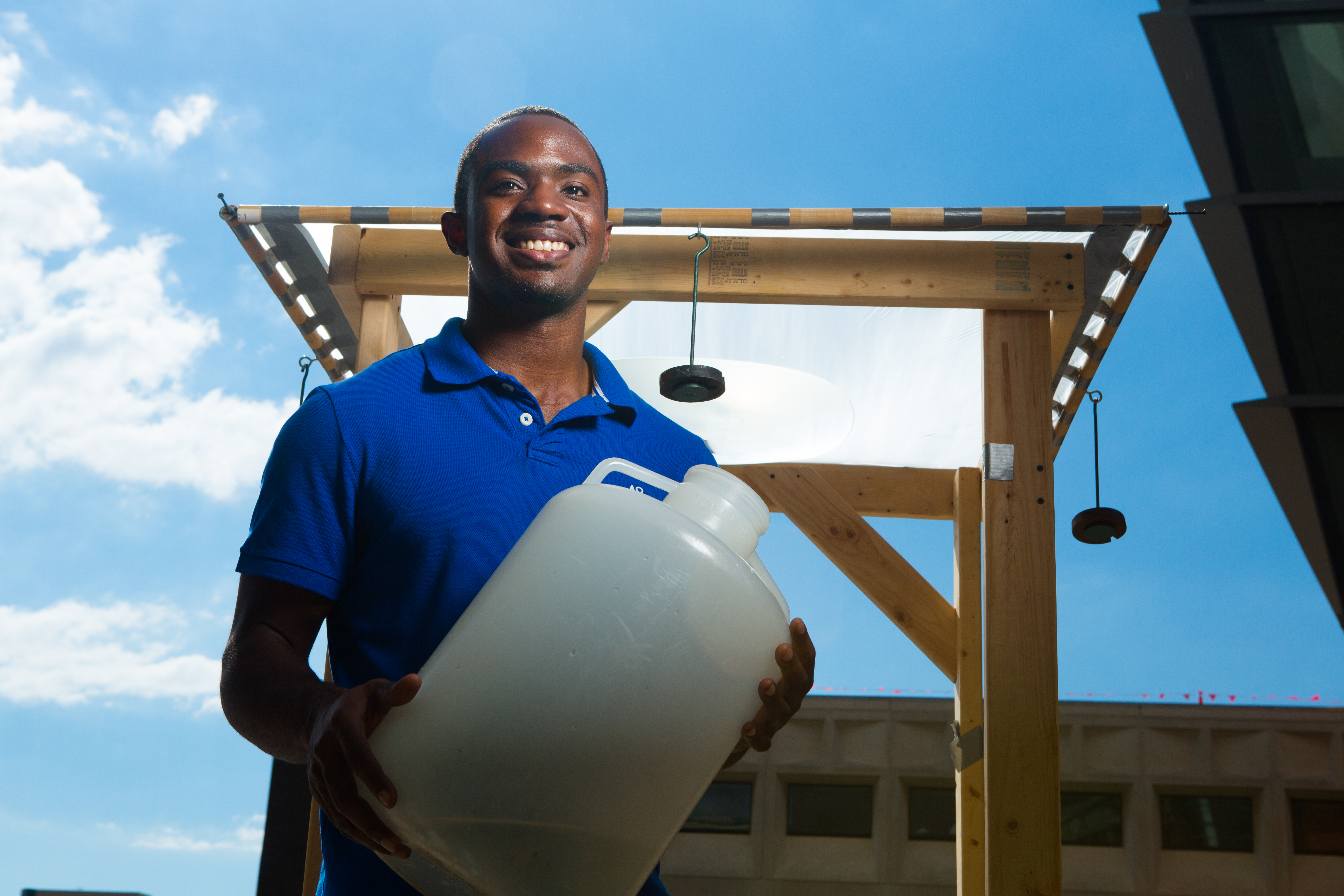 Deshawn Henry conducted research to improve a 6-foot-tall water lens that uses sunlight to disinfect water. That work is being featured on the CBS show "Innovation Nation." Credit: Douglas Levere