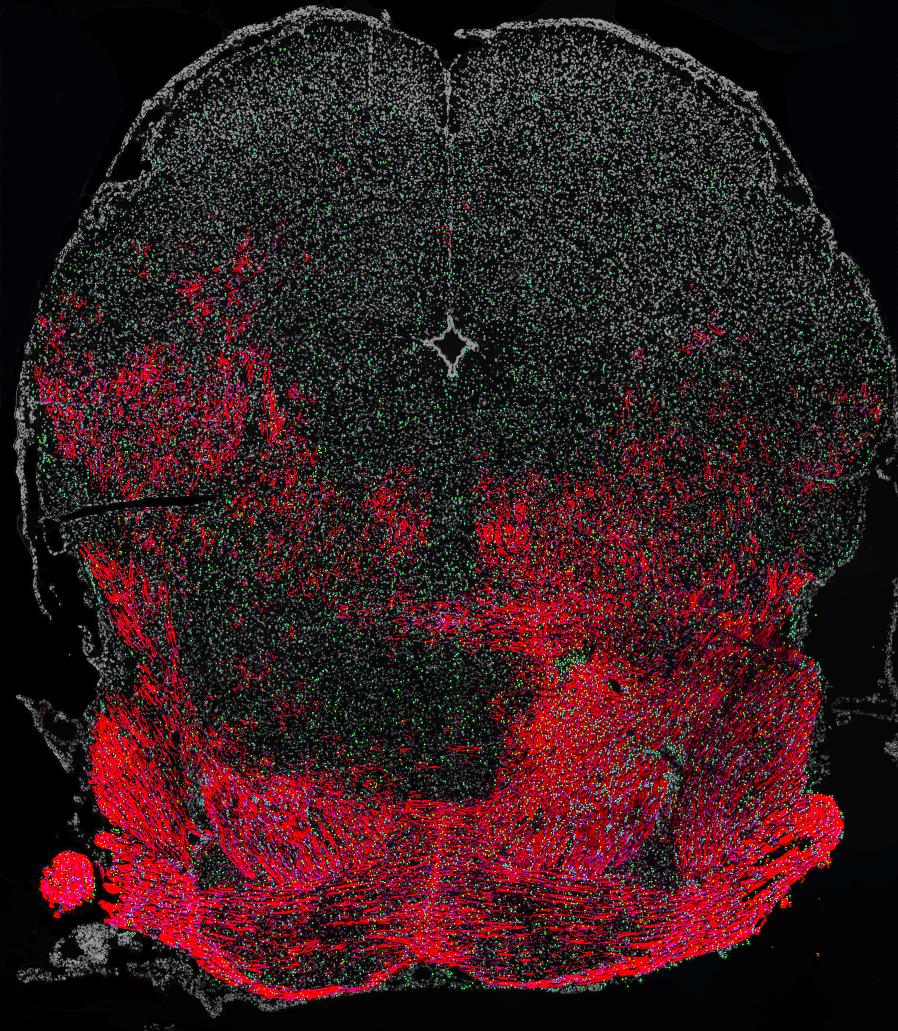 The brainstem of a myelin-deficient mouse that received a transplant of human OPCs a few days after birth and was then treated with the drug solifenacin. Daily treatment enhanced the capacity of human cells (labeled in green) to produce myelin (shown in red), which led to improved hearing in the mouse.