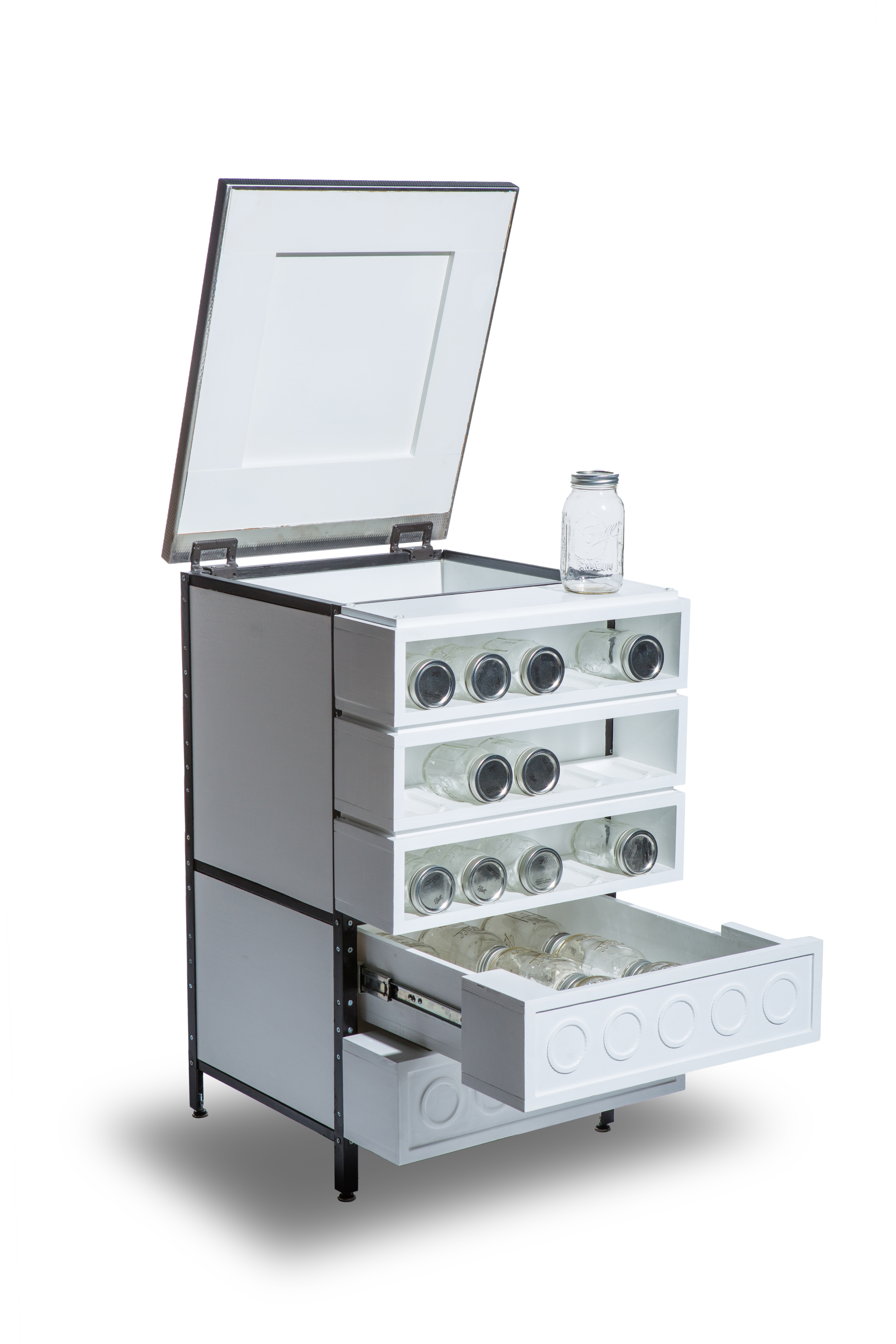This canning cabinet complements the solar GRoW Home’s urban gardening mission: The console’s lid flips open to reveal a compartment for storing a pressure canner, and four wooden shelves hold mason jars. Credit: Douglas Levere