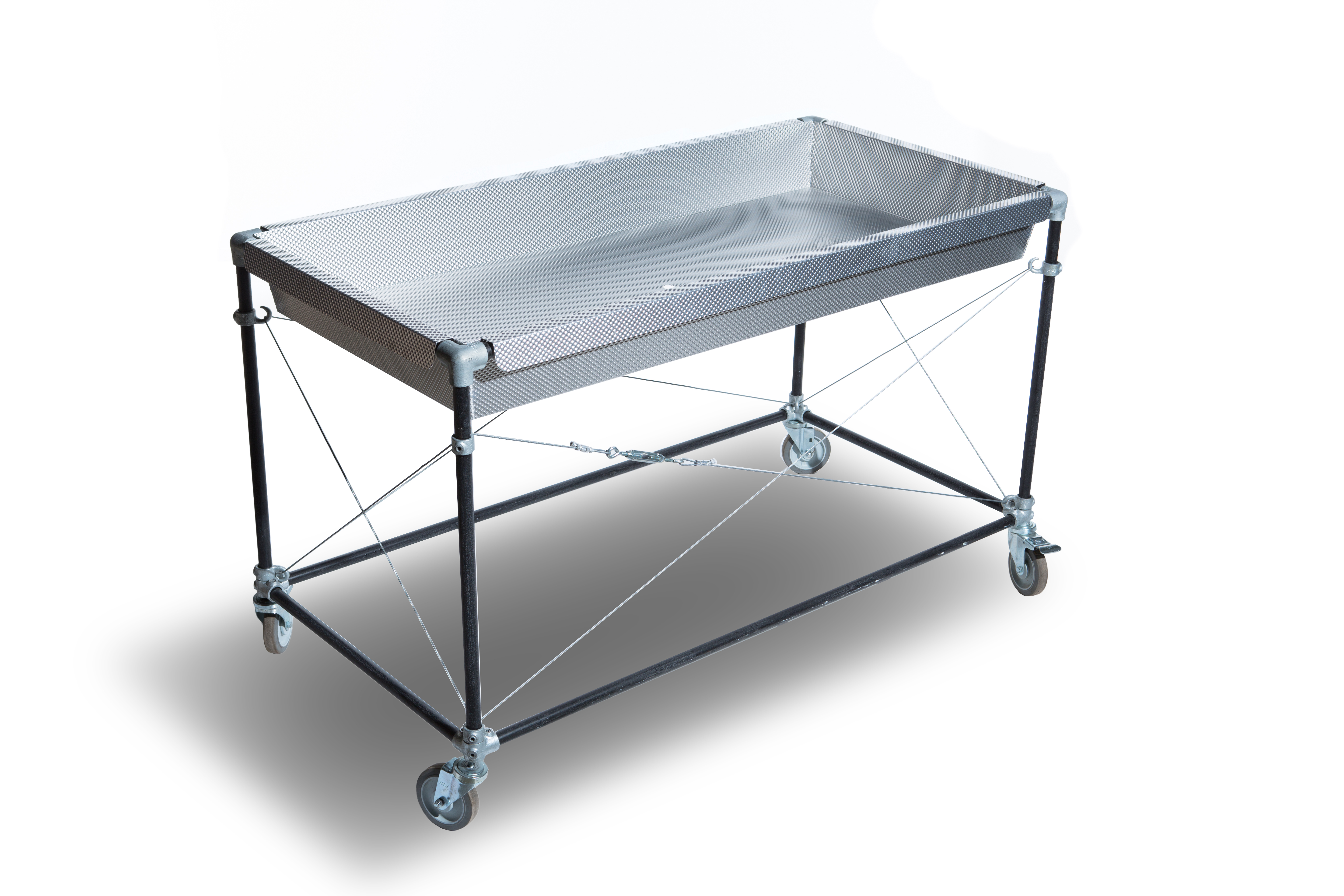 The GRoW Home’s greenhouse and solarium will house 10 of these tables. The elegant, simple design was facilitated by Rigidized Metals Corporation, which manufactured the trays, and Kee Safety Inc., which provided Kee Klamps, pipe and other hardware to hold the tables together.