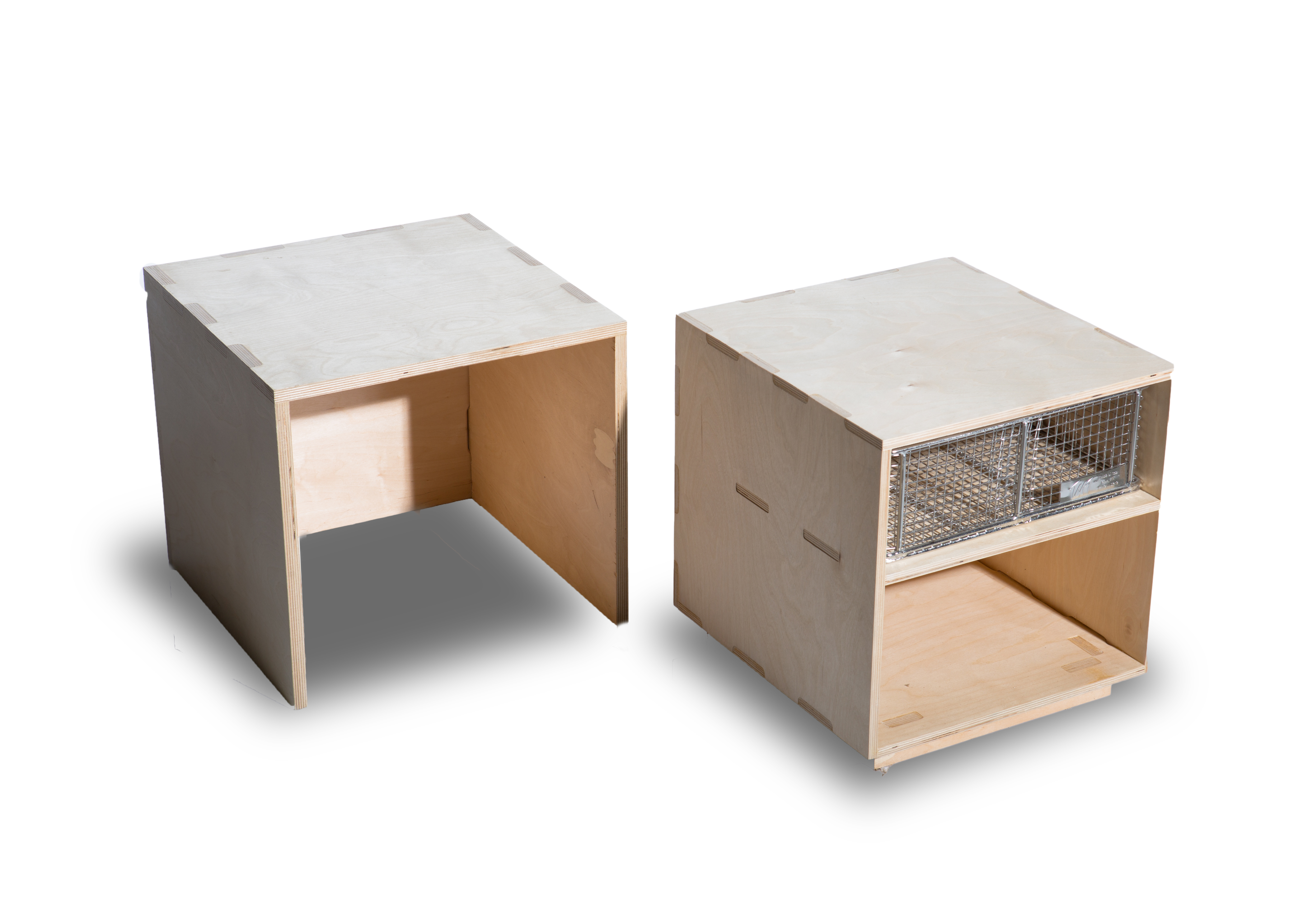 Rajkovich’s team built a pair of these multifunctional pieces. They can serve as end tables, but can also be pulled apart and used as stools or storage cubes, or combined to form a coffee table. Within the boxes, wire baskets donated by Three M Tool based in York, Pennsylvania, provide storage space for magazines, books or other supplies.