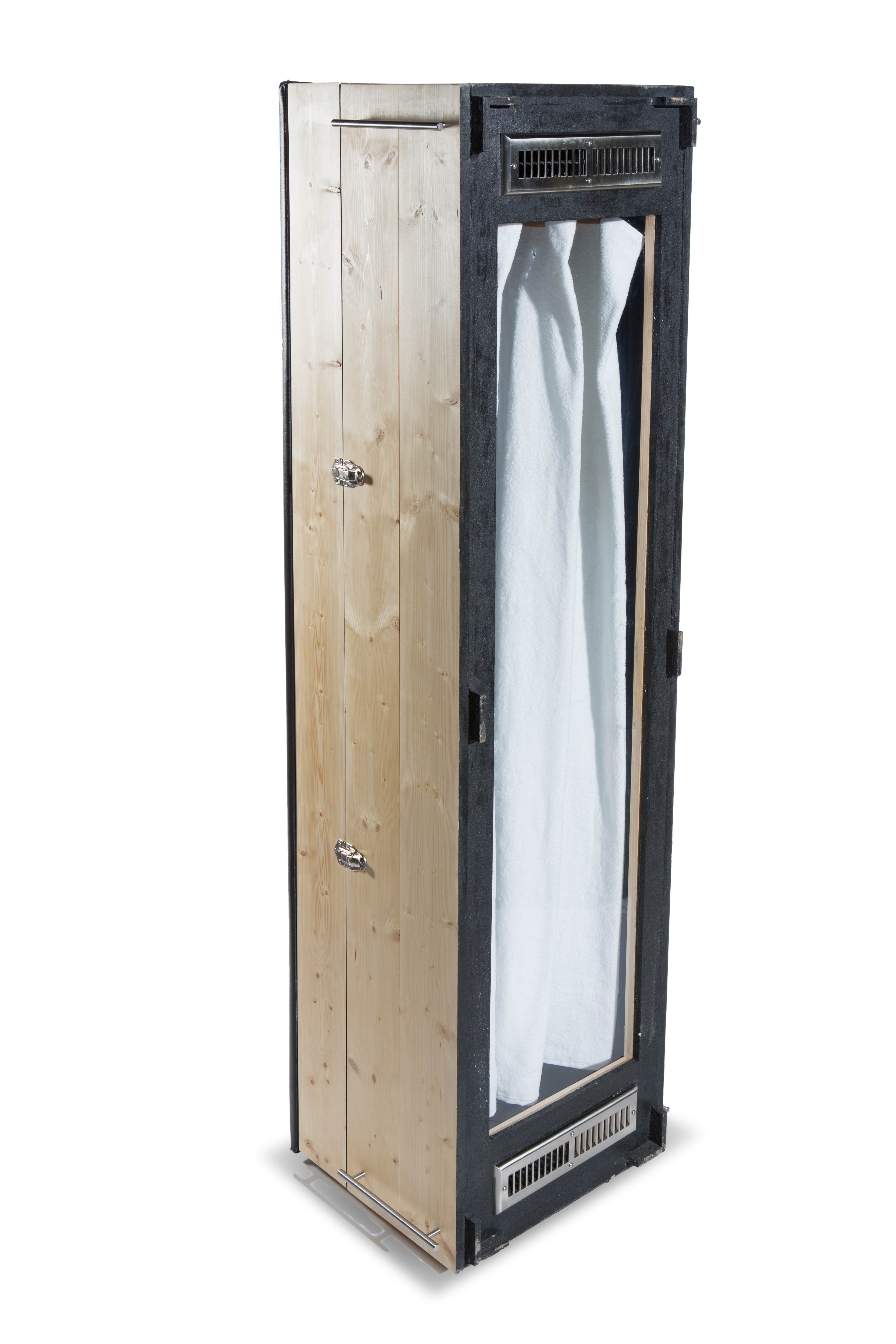 “The dryer works by pulling cool air in through a grate at the bottom and venting hot air out through a grate at the top,” says Nicholas Rajkovich, the UB faculty member who guided the student design team. “To heat the whole thing up, we have the entire interior painted black.”