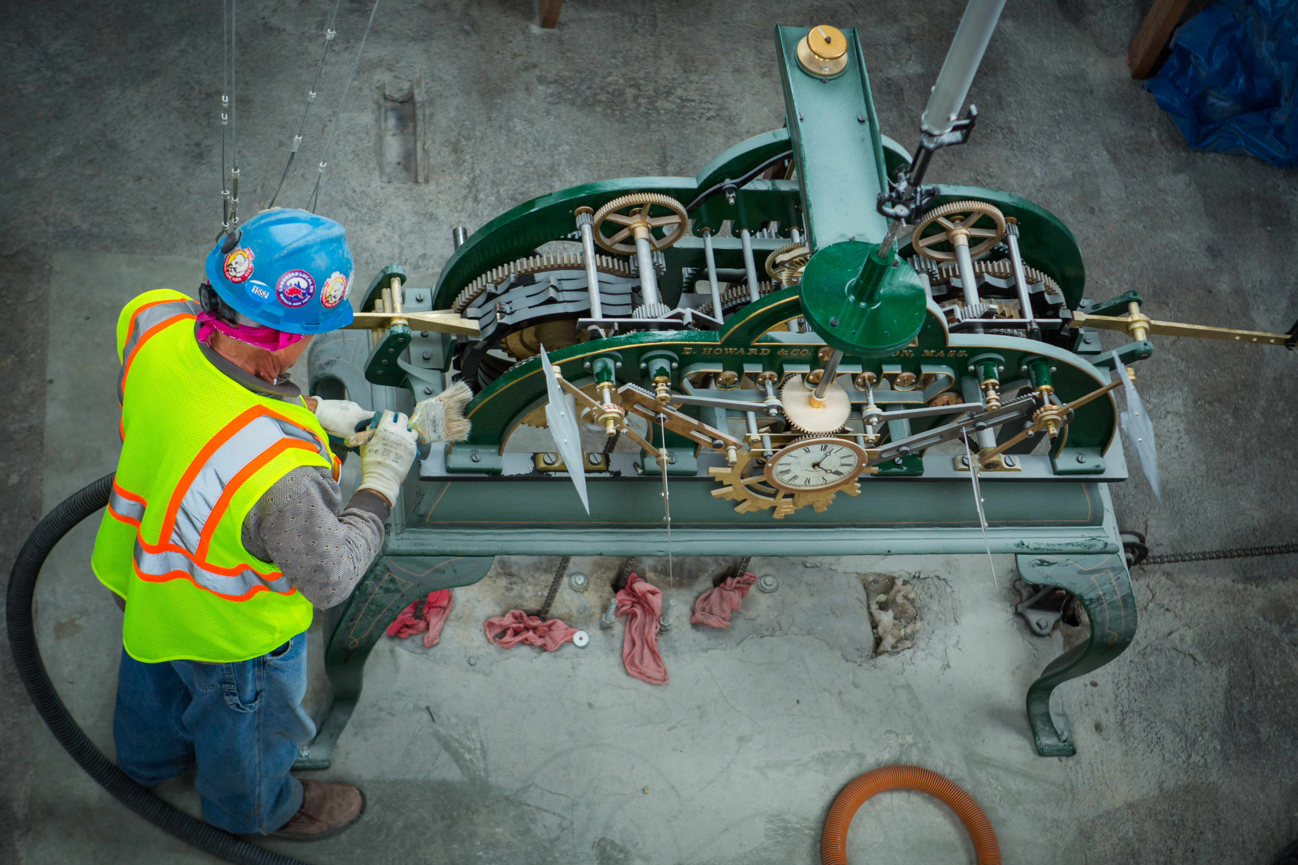 Last week, workers from Lockport-based Essence of Time were in Hayes Hall to clean the clock, brushing dust off its mechanical parts, before restarting it to keep time and chime. The company previously conducted a restoration of the clock movement — the mechanism that drives the clock — that included a historically correct repainting of the movement and the repair of many parts.
