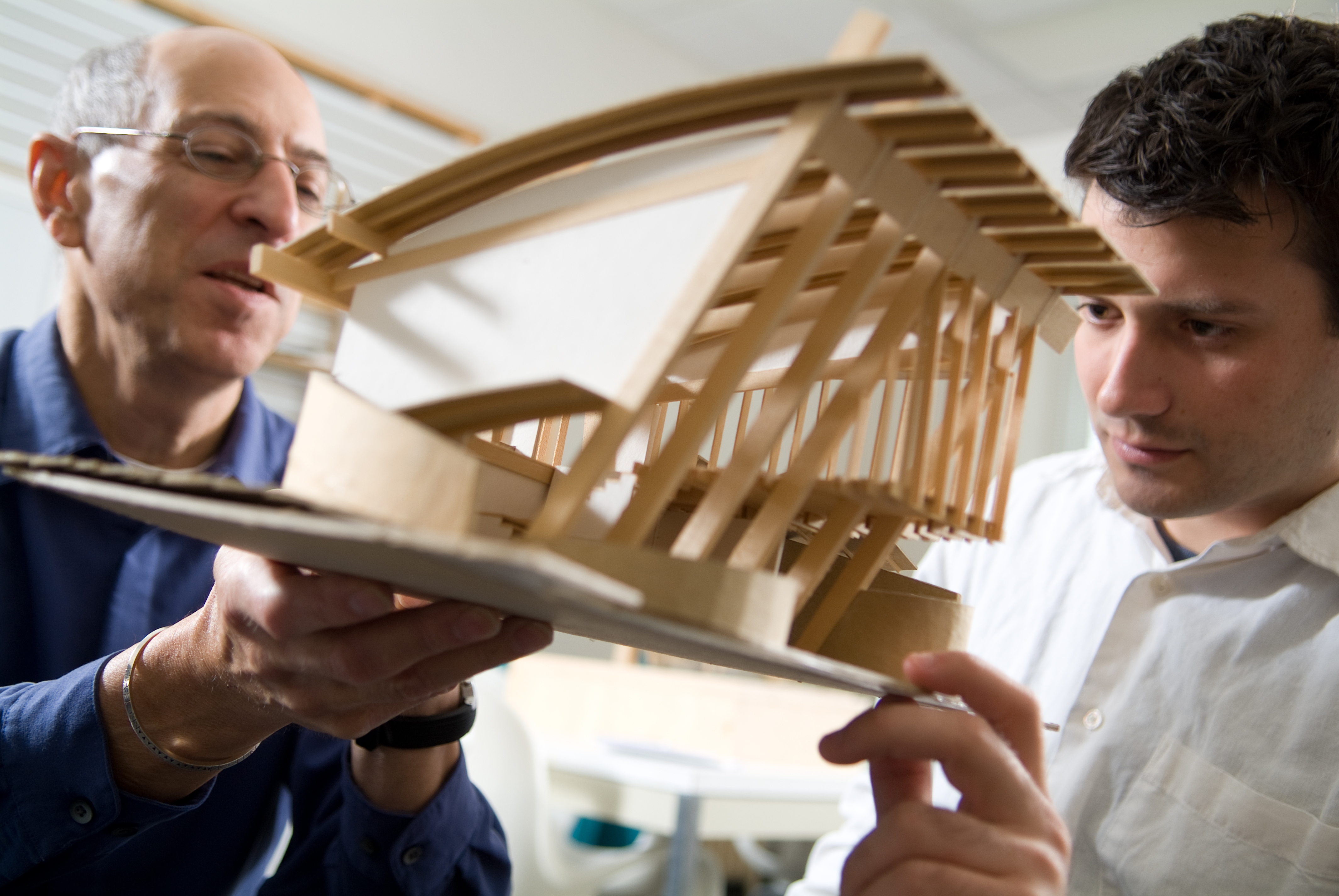 Edward Steinfeld, SUNY Distinguished Professor and director of the University at Buffalo's Center for Inclusive Design and Environmental Access (IDeA Center), works with a student in the IDeA Center. Photographer: Douglas Levere