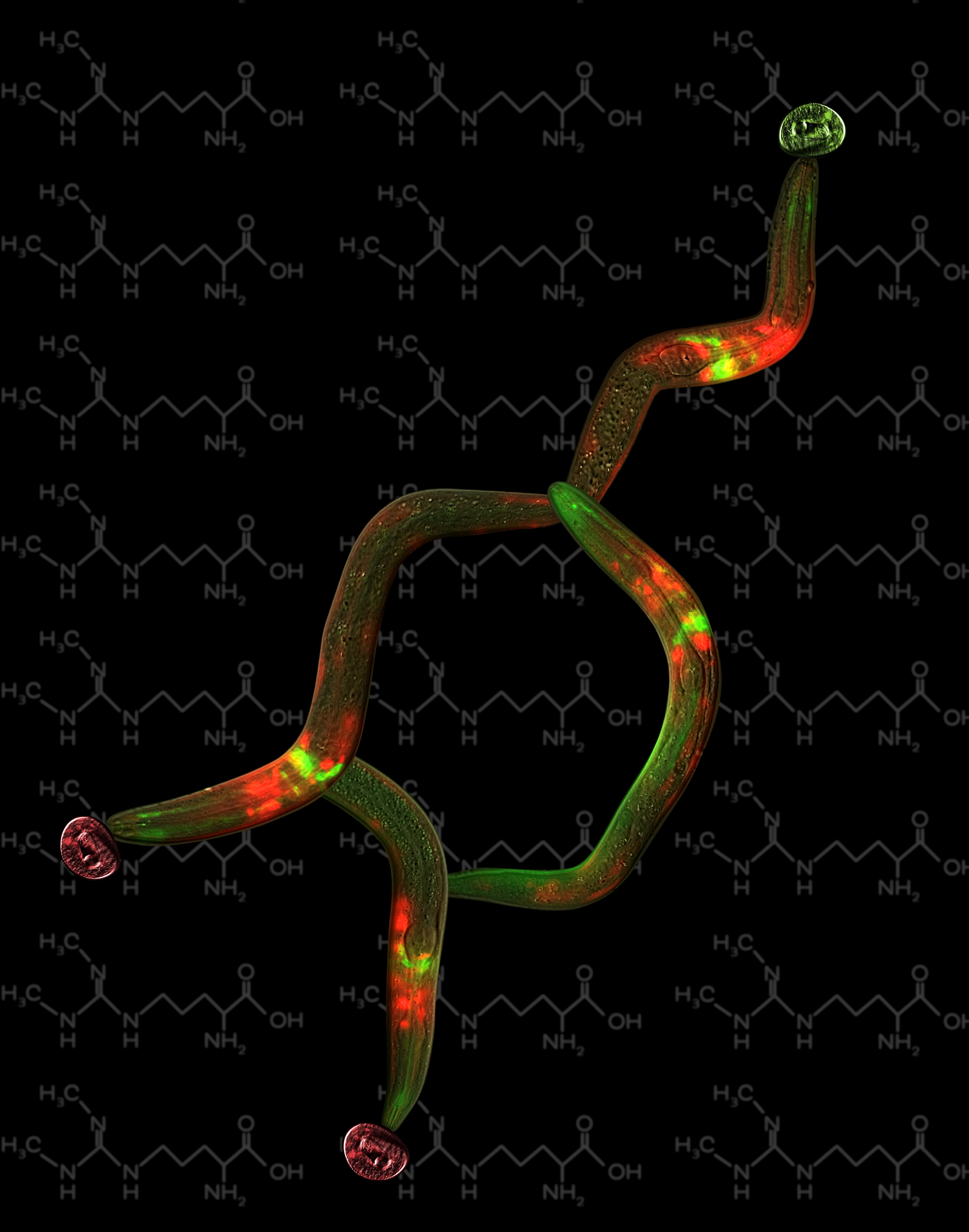 Artists’ illustration featuring microscope images of the worm species C. elegans arranged to depict the chemical structure of dopamine. Credit: Anisha Lanewala, Jordan Wood, Neah Likhite and Denise Ferkey