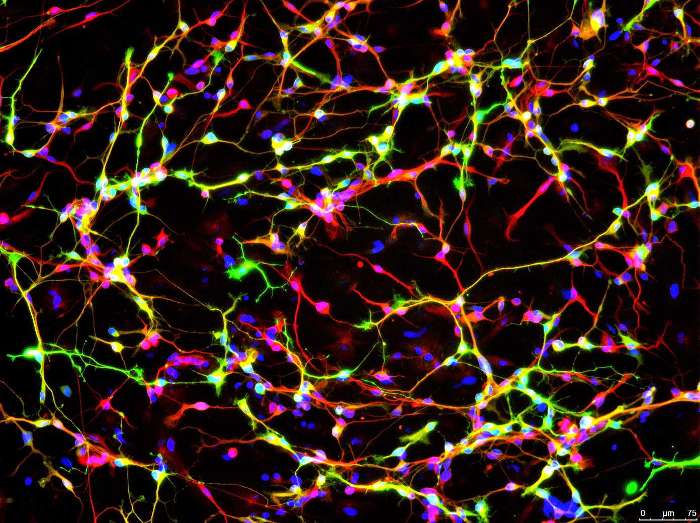 UB researchers converted these dopamine neurons directly from human fibroblasts. Image shows a protein found only in neurons (red) and an enzyme that synthesizes dopamine (green). Cell DNA is labeled in blue.