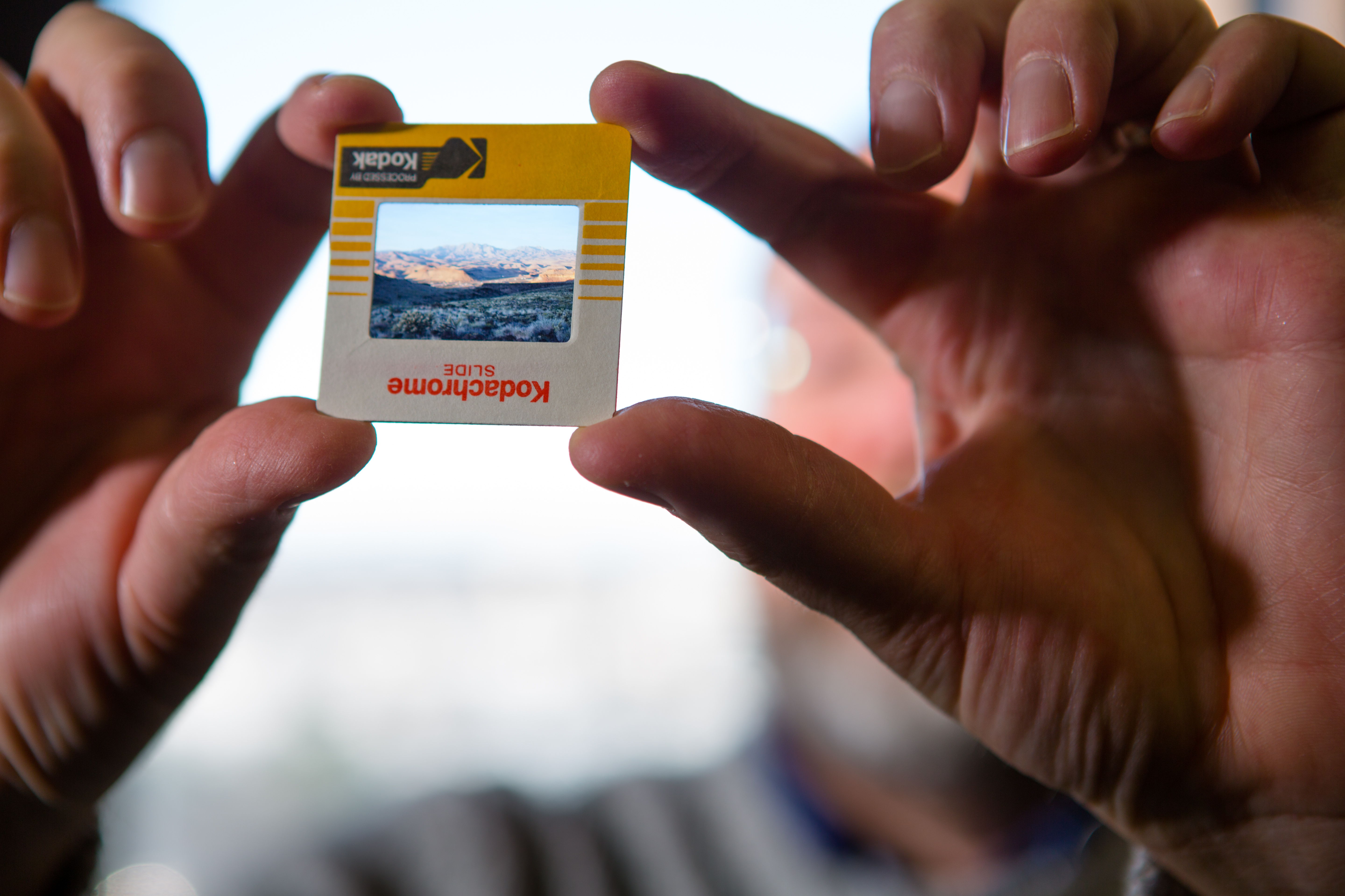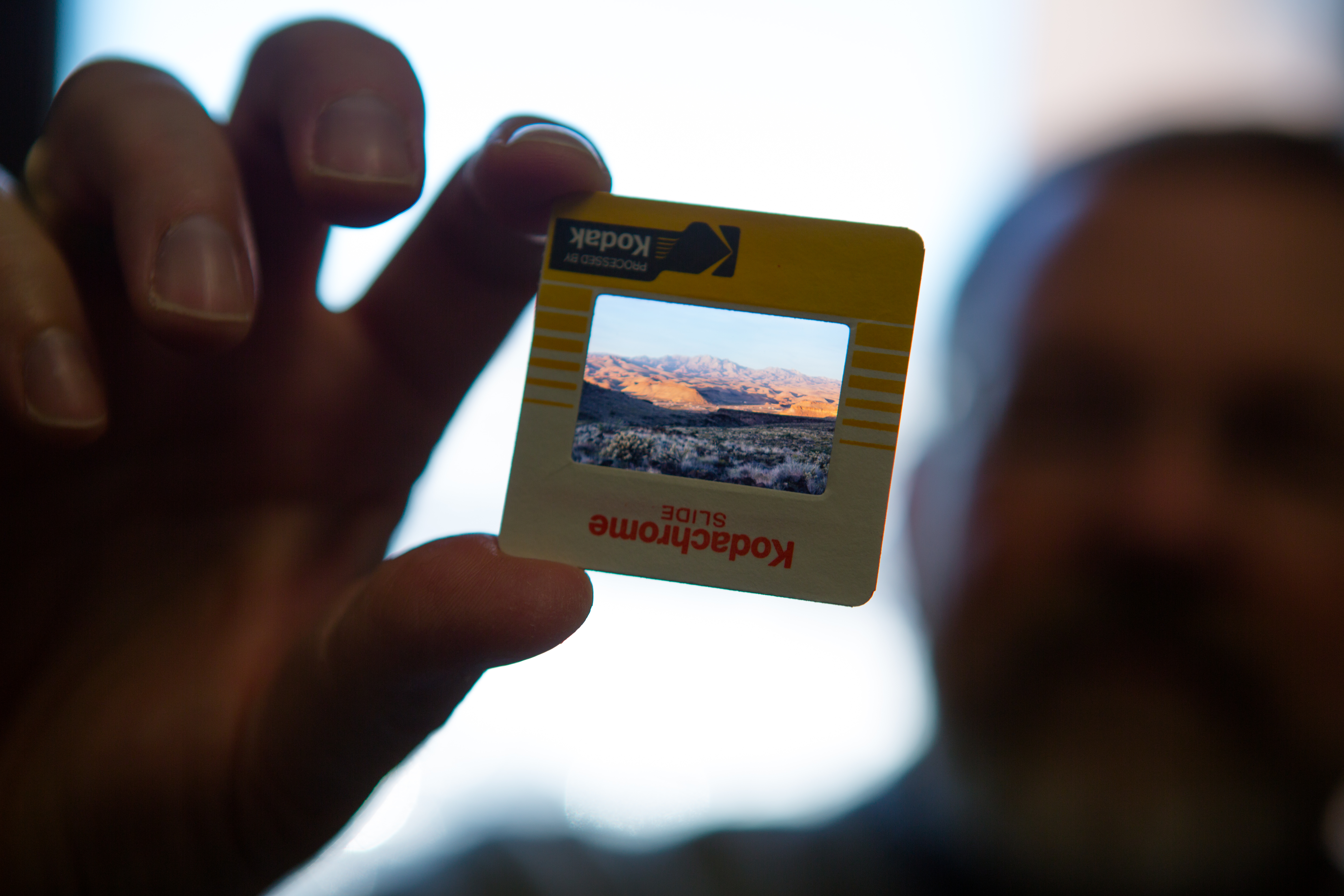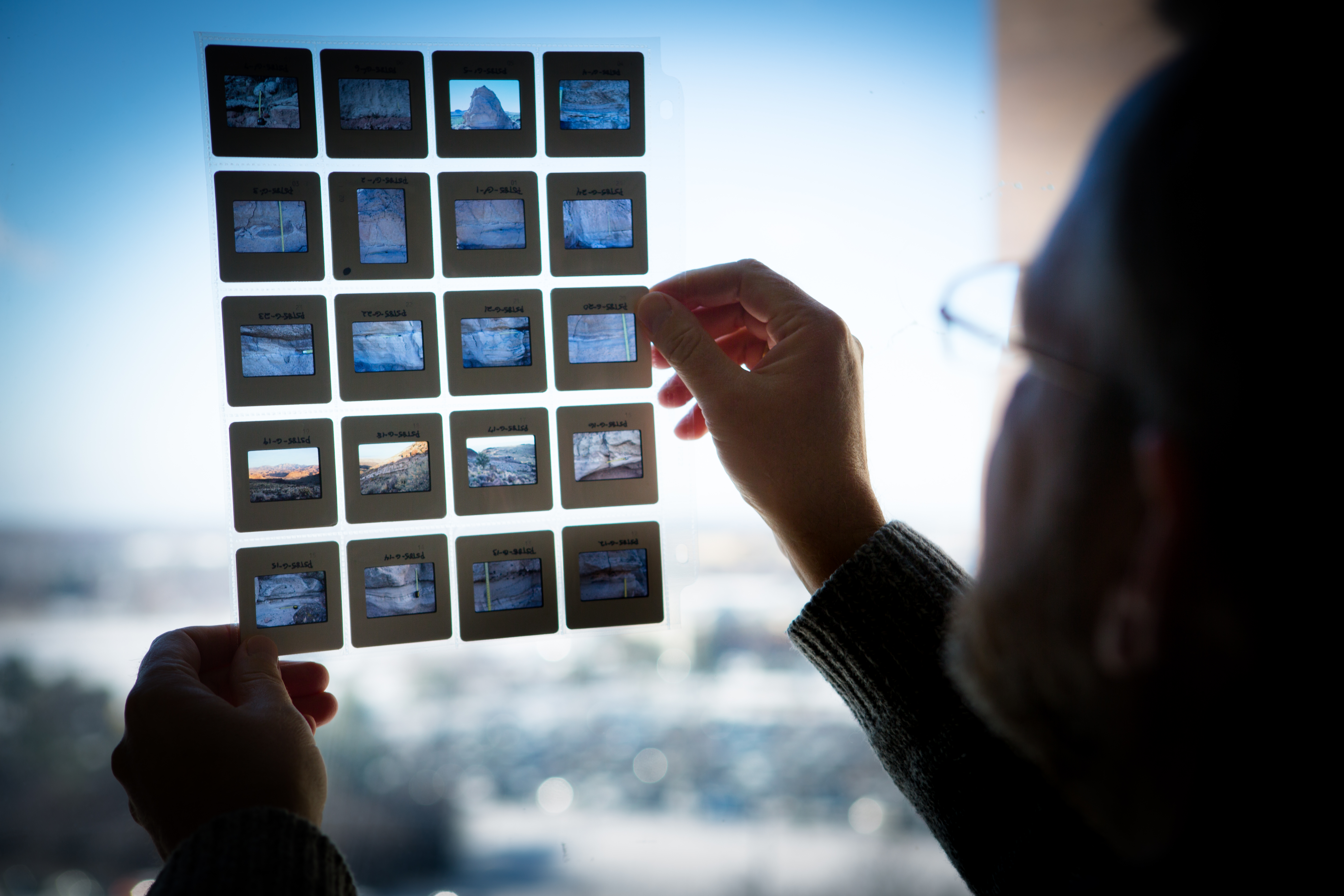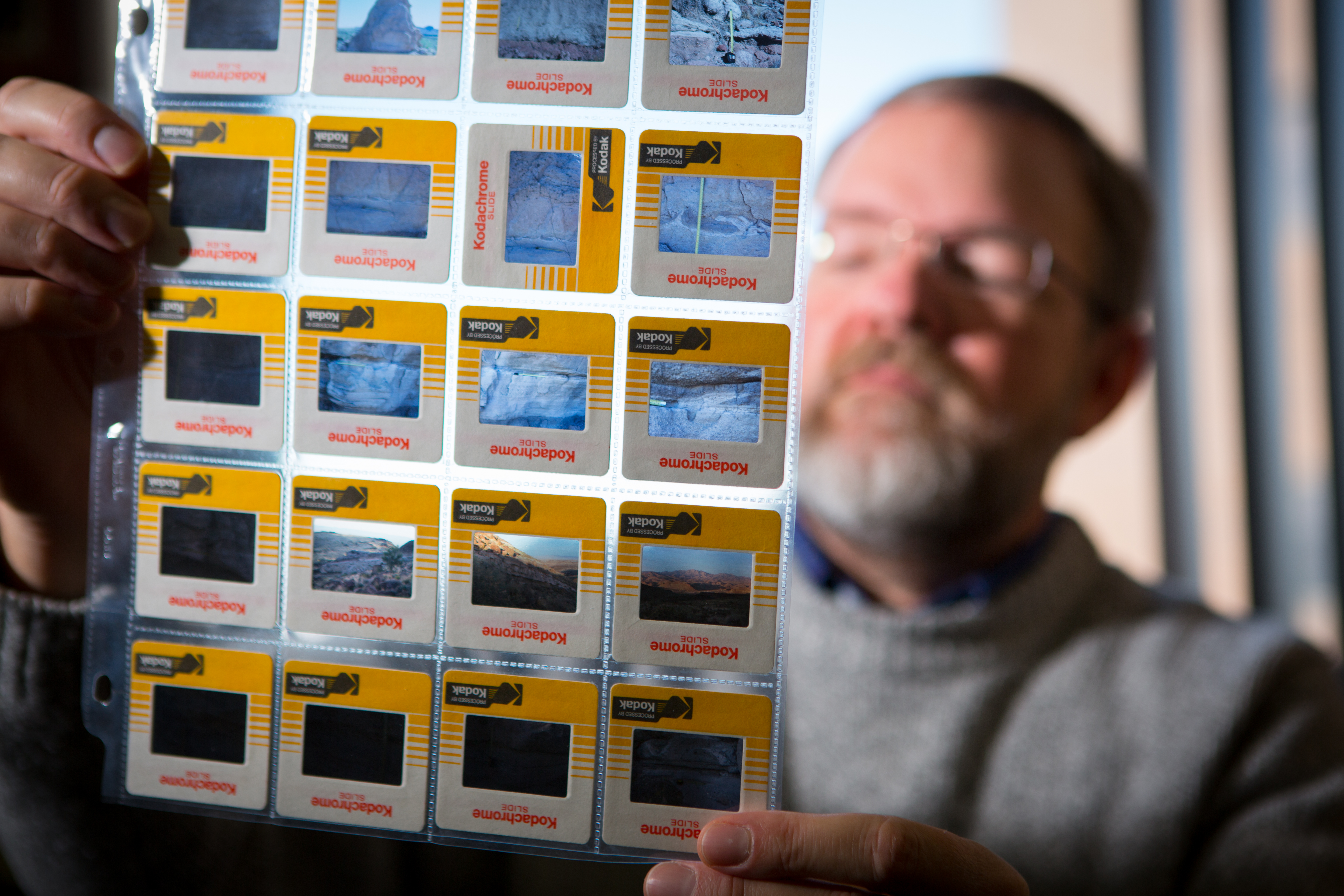 University at Buffalo geology professor Greg A. Valentine holds up Kodachrome slides showing photographs of geologic formations associated with the eruption of the Silver Creek caldera supervolcano 18.8 million years ago. Valentine collected the data in the 1980s as a PhD student. Credit: Douglas Levere