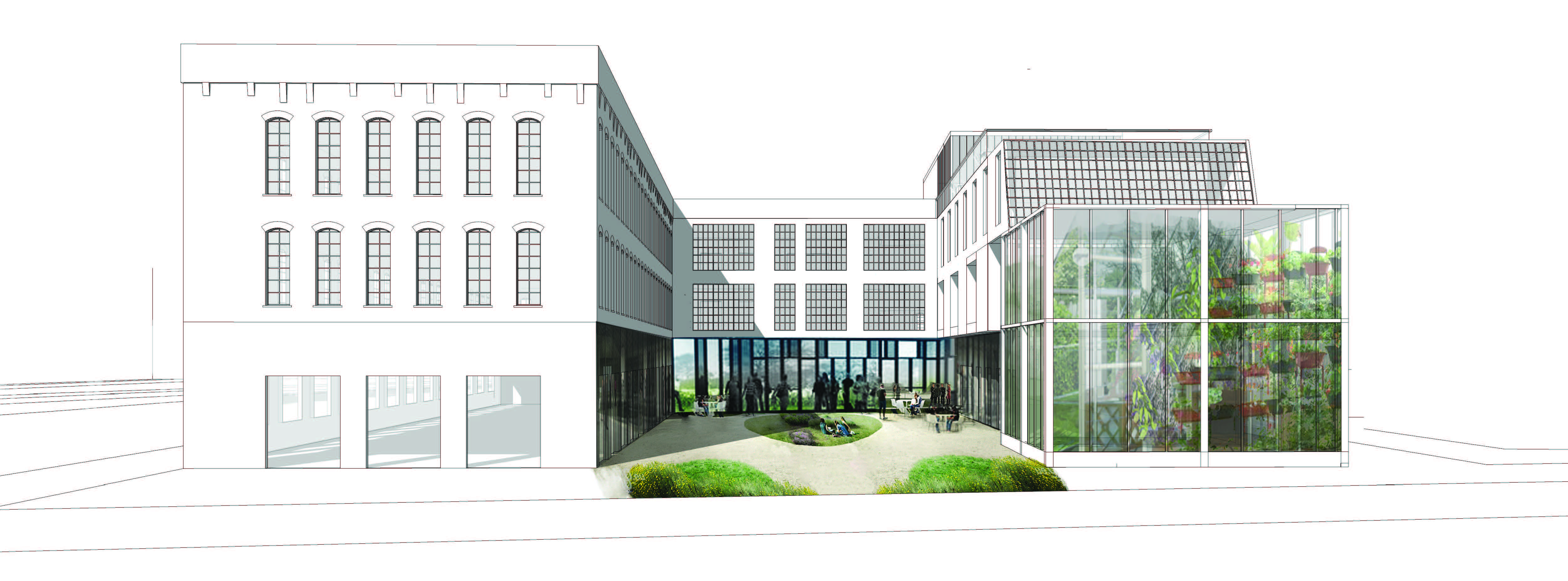 This rendering depicts the former Duffy silk building on Buffalo' East Side rehabilitated as a temporary housing facility for refugees being resettled in the city. It was developed as part of a spring studio in UB's School of Architecture and Planning.