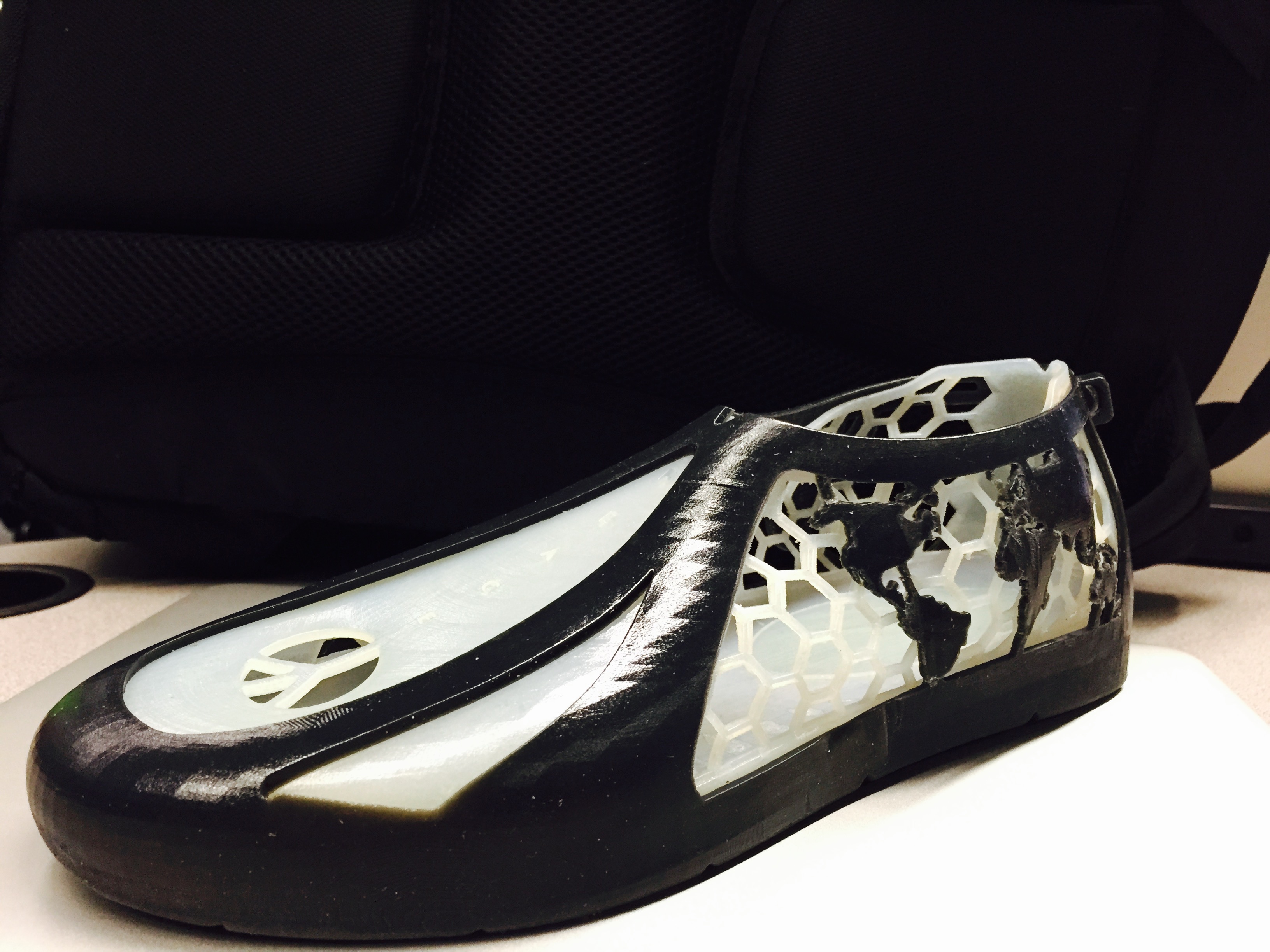 The students say they selected the name of the shoe project — “Peace — art meets technology to shape a better future” — to convey a message of world peace. The design features illustrations of a world map, a dove, olive leaves and the peace symbol to help convey that message.