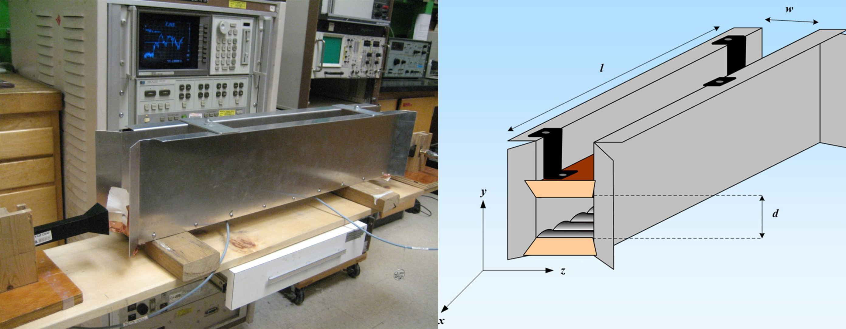 A photograph (left) shows the experimental set-up used to confirm the existence of the Bloch wave resonance, which was first predicted theoretically. An illustration (right) shows the interior of the experimental device, called a hollow periodic waveguide, which consists of two corrugated metallic plates separated by a variable distance of about one inch, and the upper plate can slide with respect to the lower. When researchers shot microwaves between the plates through the air, they were able to control which wavelengths of microwaves were allowed through by varying the position of the upper plate. Credit: Lab of Victor Pogrebnyak/University at Buffalo